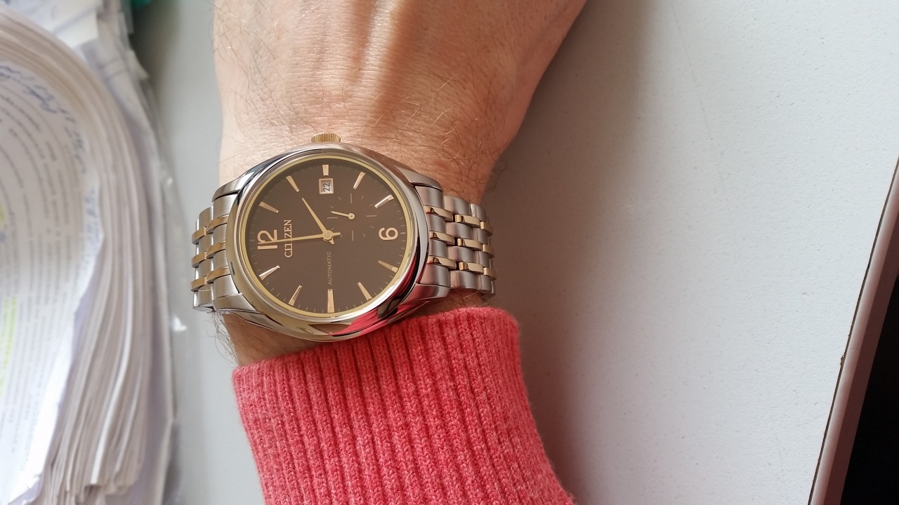 Мой первый биколор. Качество отделки на высоте впрочем как любой Citizen. Циферблат темно коричневого цвета, на солнце играет- переливается темно бордовым цветом,к сожалению поймать цвет телефонным фотоаппаратом сложно. Стекло сапфир. Люм на данной модели отсутствует,что меня абсолютно не огорчает. В живую часы смотрятся очень красиво.