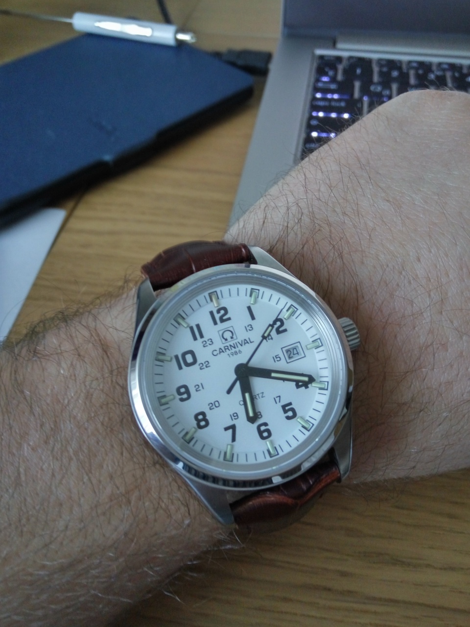 Тем временем Carnival сменил лого, и теперь вместо джанинхуа на часах надпись Carnival! Swiss quartz и Swiss brand тоже убрали, что радует! Купил за 5200 на Али. Доставка 15 дней почтой Нидерландов. Тритий великолепен. У меня есть старенькие Casio, на них люм светит ярче только если фонариком на него посветить. Вчера засек - примерно 40 минут после фонарика он светит ярче чем тритий, а потом сдувается. Так что приобретением доволен.