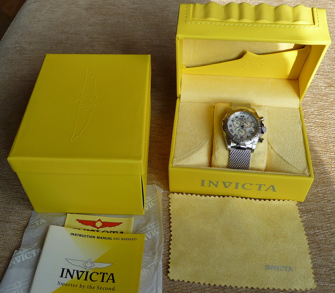 Продам новые в плёнках и полном комплекте INVICTA хронограф. Швейцарский кварц, размер 43мм. Указатели дня недели, даты под лупой и хронограф с возможностью промежуточного измерения. Цена 13.500 руб.