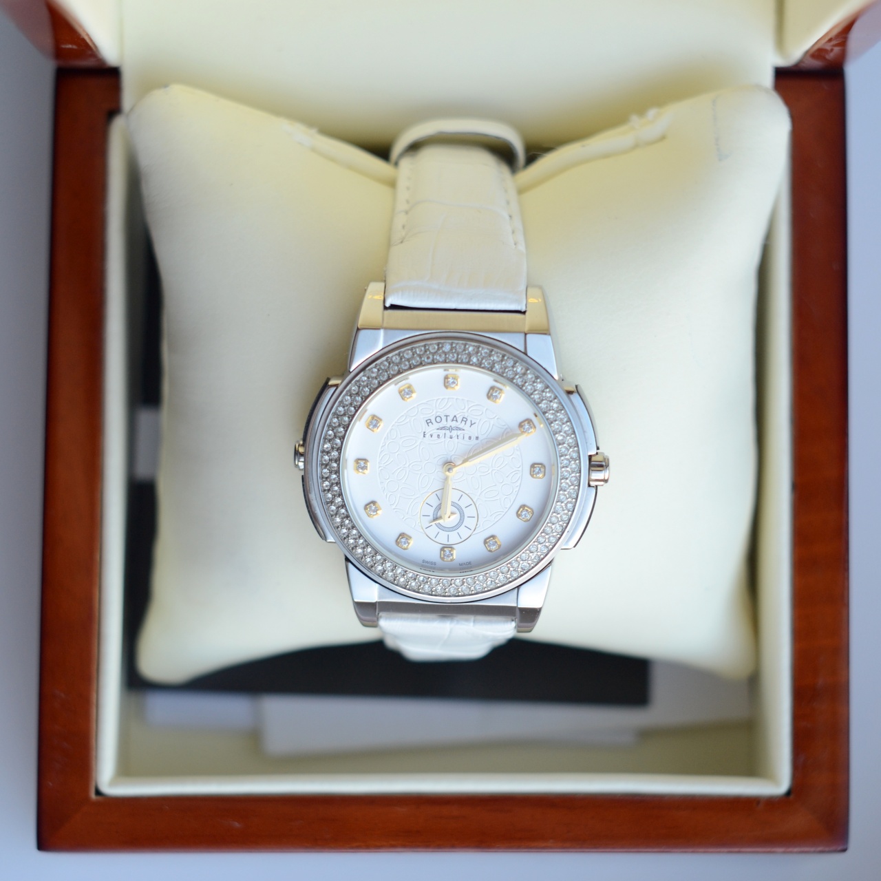 Первый - светлый, с цветочным орнаментом, золотыми стрелками и метками, а также дополнительным секундным циферблатом. Метки часов и безель украшены кристаллами Swarovski.