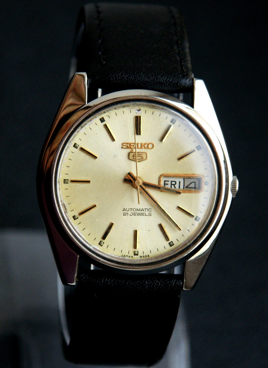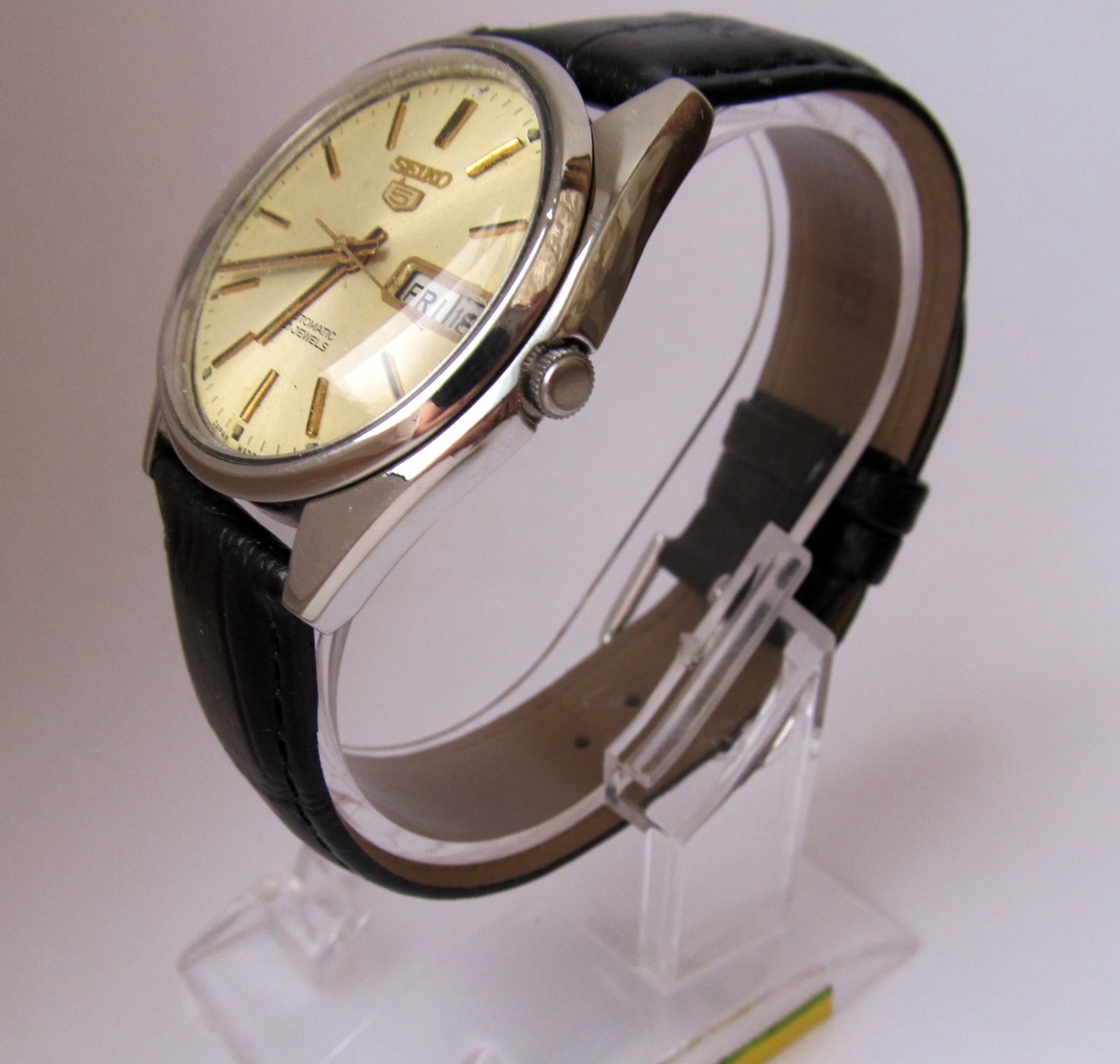 Классика! Очень солидные и приятные костюмные часы Seiko 5 группы "А". Великолепный винтаж. Настоящие. Сделано в Японии. Отличный механизм с автозаводом и мягким ходом, что видно на движении центральной секундной стрелки. День-дата на 3 часа с функцией быстрого перевода. Второй календарь на арабском. Часы обслужены, механизм отрегулирован и точно держит время. Красивый циферблат с лёгким оттенком кремового цвета.. Контрастные стрелки. Корпус отполирован,в отличном состоянии, не имеет каких либо повреждений и дефектов. Новое обтекаемое стекло. Новый кожаный ремень черного цвета . Размер корпуса 38Х40 мм (без головки) Толщина со стеклом 12 мм. Часы куплены в 2015 году, практически не носились только были обслужены в часовой частерской. Внешний вид хорошо виден на снимках. Дополнительно отвечу на вопросы. Доставлю по России бесплатно... Гарантирую очень надёжную упаковку и незамедлительную отправку покупателю.