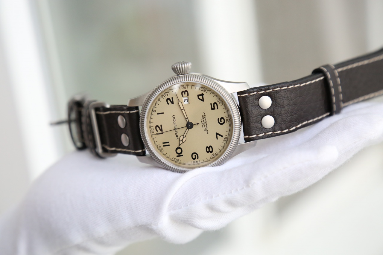 Воплощая новаторский дух коллекции Khaki, эта цепляющая взгляд модель гармонично сочетает в себе винтажные цвета циферблатов и стрелок с традиционным дизайном безеля и заводной головки. Циферблат, обрамленный 42 мм корпусом, защищен сапфировым стеклом; автоматический калибр обеспечивает долговечность и функциональность.