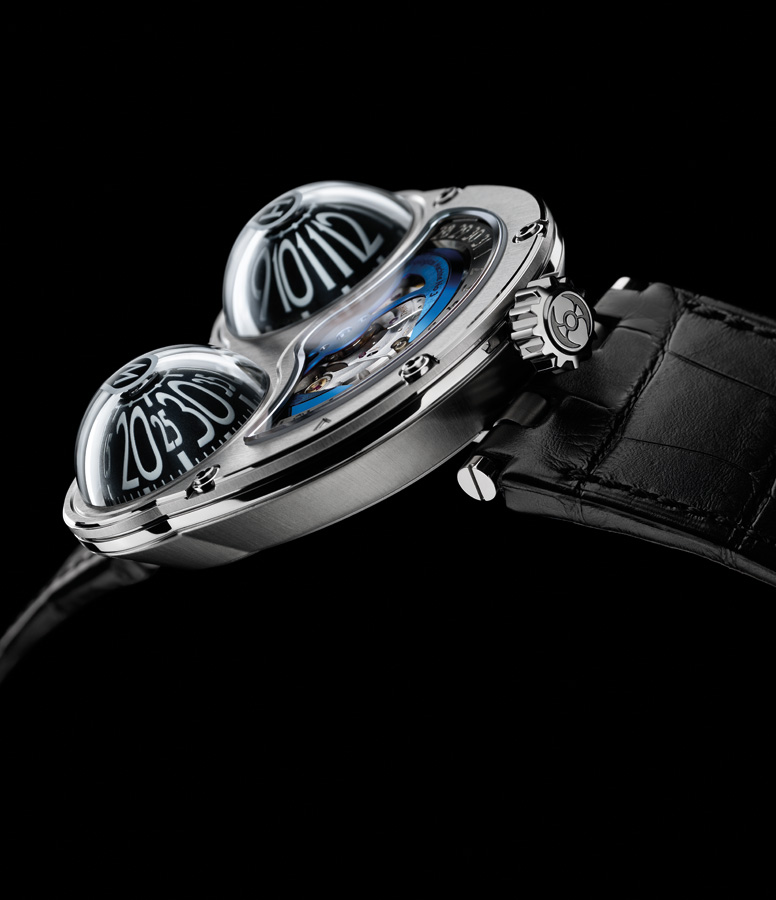 Выпуклые глаза земноводной лягушки позволяют ей смотреть в разных направлениях, не поворачивая головы. В свою очередь, выпуклые полусферы «Лягушки» HM3 обладают противоположной, однако не менее важной характеристикой – они позволяют обладателю часов считывать показания времени в разных положениях руки, без необходимости поворачивать запястье. Модель Frog существенно отличается от своей предшественницы – Часовой машины №3. Новинка оснащена алюминиевыми полусферами, вращающимися под сапфировыми стеклами, в то время как в модели HM3 конусы остаются неподвижными и вращение вокруг них осуществляют часовая и минутная стрелки.