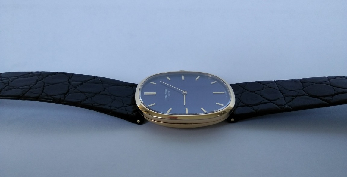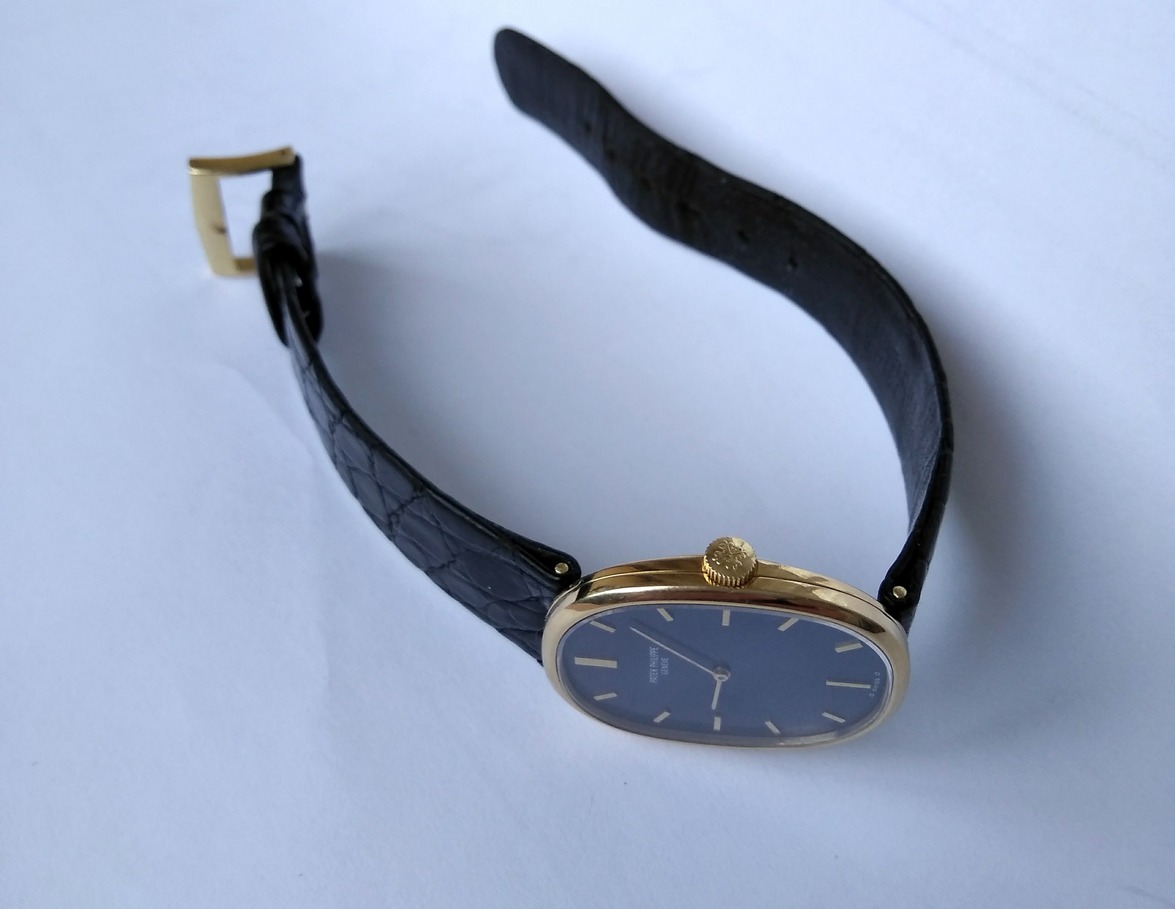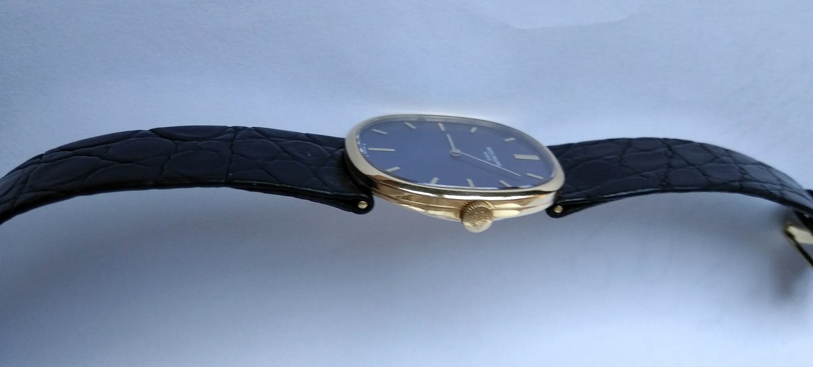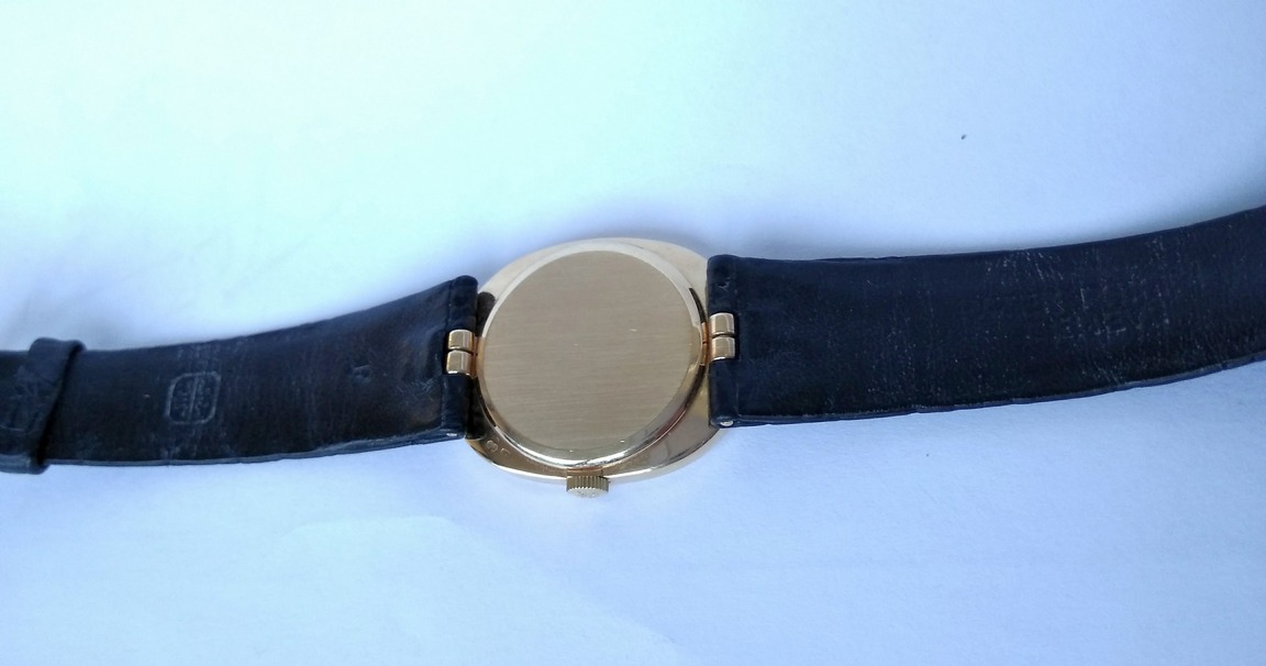 Корпус золото 18 карат. Размер корпуса 27 x 32 мм. Механизм механический с ручным заводом. Модель винтажная 90-х годов, но на руке смотрятся удивительно современно и стильно. Часы в почти идеальном состоянии, ремешок из крокодиловой кожи имеет нормальный износ, поэтому общее состояние поставил А.