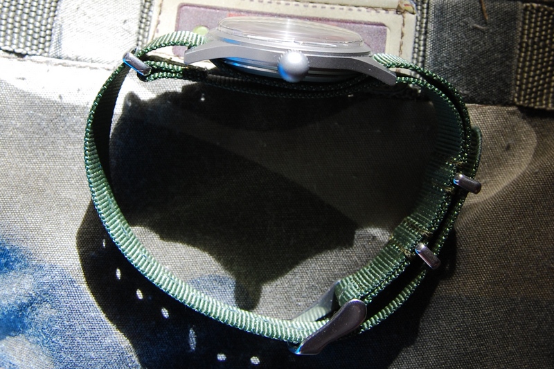 Ремешок текстильный, так называемый "натовский", с интересной системой крепления на часах. Со стороны пряжки ремешок раздваивается; длинный его конец продевается, как обычно, через ушки часов, а затем протягивается через проушину, закреплённую на коротком конце, и уже затем закрепляется в пряжке. Таким образом, часы остаются жестко зафиксированы на ремешке и не сползают по нему. Усмотрел один минус - отверстия для крепления рабочего конца ремешка в пряжке не усилены металлическими обжимными кольцами. Как их отсутствие скажется на износостойкости ремешка, покажет время. Читал, что натовские ремешки с этими самыми обжимными кольцами на отверстиях в природе существуют.