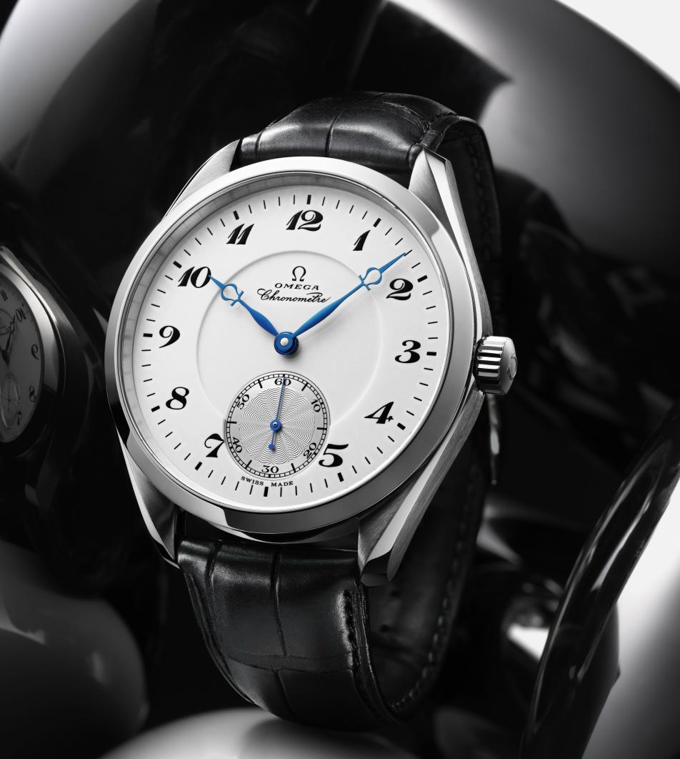 Двухуровнеый циферблат, покрытый белой эмалью. Стрелки из вороненой стали. На концах часовой и минутной стрелок - вырезанные лазером логотипы бренда Omega, основанные на дизайне, запатентованном компанией Omega в 1924 году. Встроенный боковой секундный циферблат на 6 часах изготовлен из накладного серебра и добавляет тонкий третий уровень на циферблате.