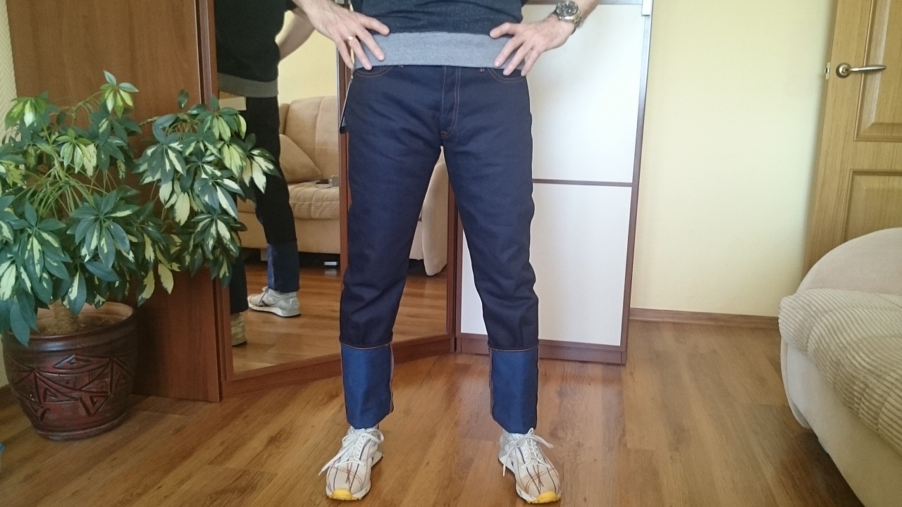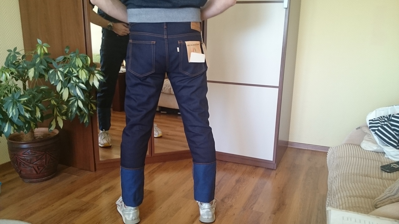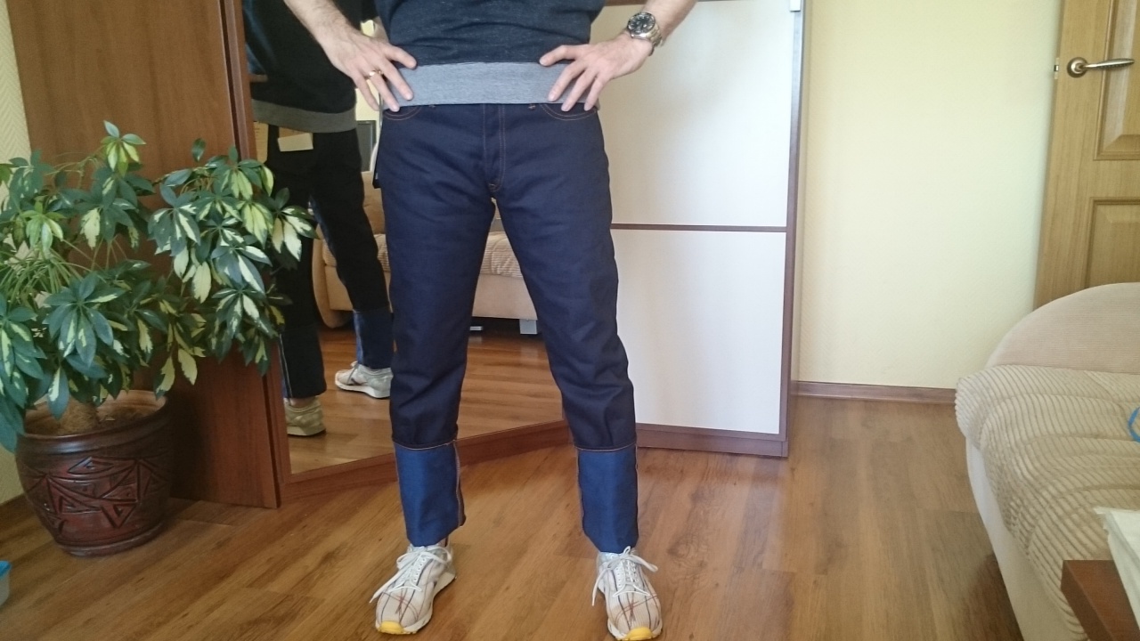 гладкий плотный деним, шикарный цвет, даже с еле заметным блеском. Синий вефт просвечивает при ближайшем рассмотрении, очень заманчиво. Видно, что фейд будет быстрым. Интересно, каким он будет - посмотрим.