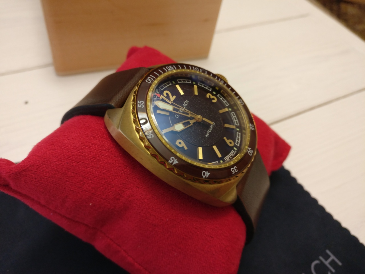 Очень красивый корпус из латуни, патина будет потрясающая. В комплекте очень мягкий и комфортный ремень из кожи.