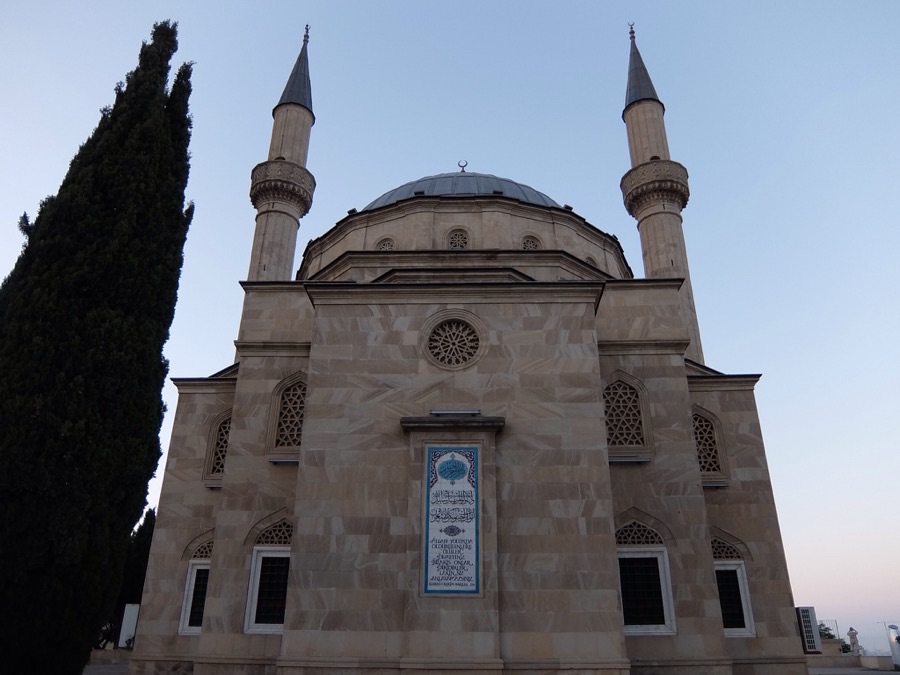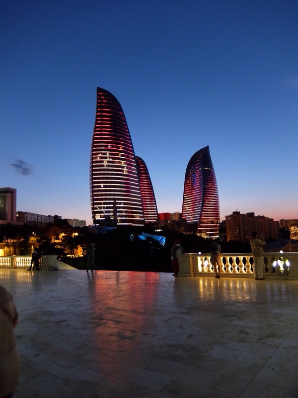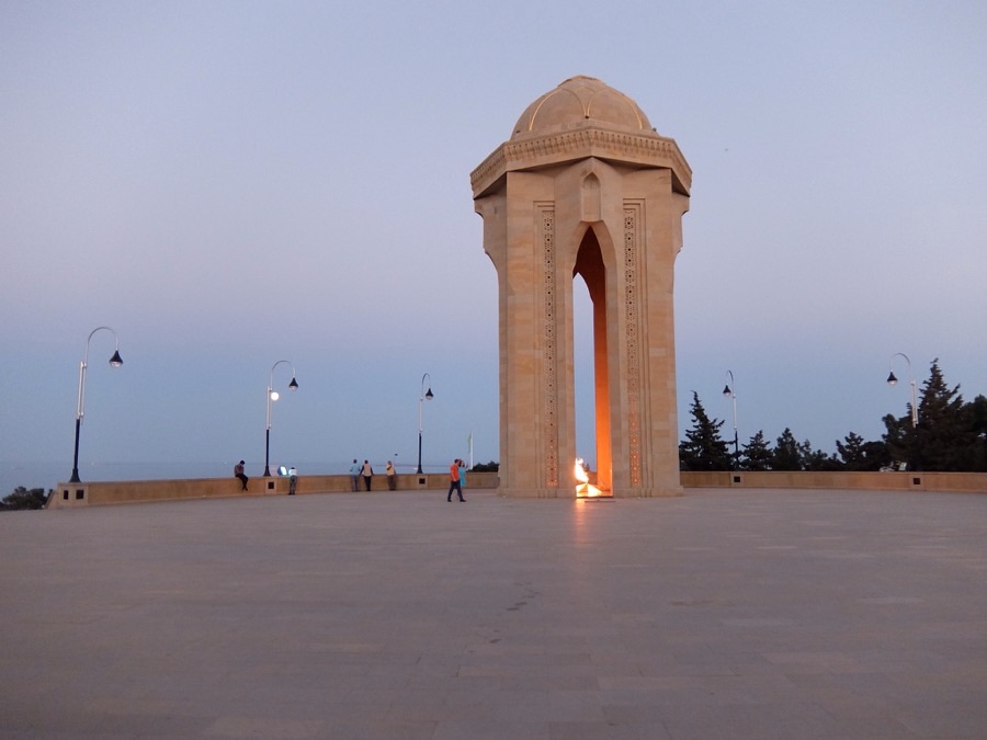 Вечером посетили парк, где похоронены знаменитые люди Азербайджана. Везде очень чисто, тихо и прекрасный воздух от растущих кругом сосен и кипарисов. Далее была Аллея Шахидов - несколько ярусов захоронений азербайджанцев, погибших в разных конфликтах, случавшихся в ХХ веке: Великая Отечественная, и события времён распада СССР и, конечно, Карабах. Там же вечный огонь и турецкая суннитская мечеть. Аллея расположена на холме, откуда открывается красивый вид на бакинскую бухту и высочайшие здания Азербайджана - Пламенные башни. Посмотрели Площадь флага, флаг на которой долгое время был крупнейшим в мире. Сейчас он на третьем месте, но всё равно очень впечатляет, фотографией этого не передать. Здесь же Музей ковра в форме ковра и бакинская Венеция, по которой можно даже прокатиться на лодке с местным гондольером в полосатой майке.