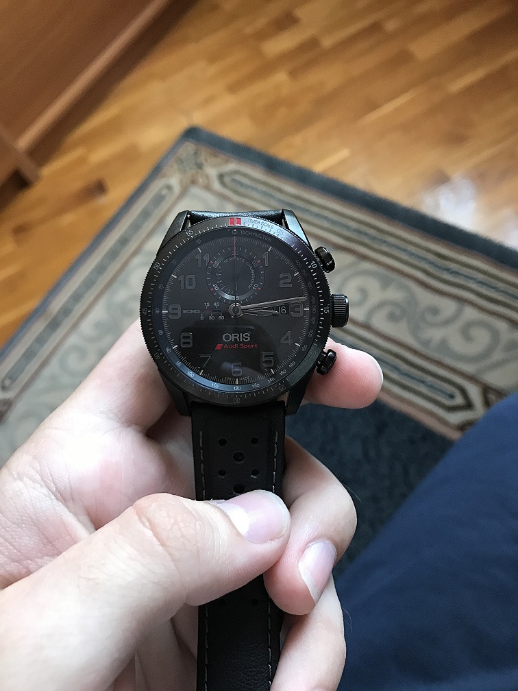 Спустя месяц поиска и после неожиданного притока средств решил остановить свой выбор на ORIS 778 7661 77 84 LS или же, как их еще называют, ORIS AUDI SPORT LIMITED EDITION II. Экземпляр 96 из 2000 всего произведенных. Ну и фото