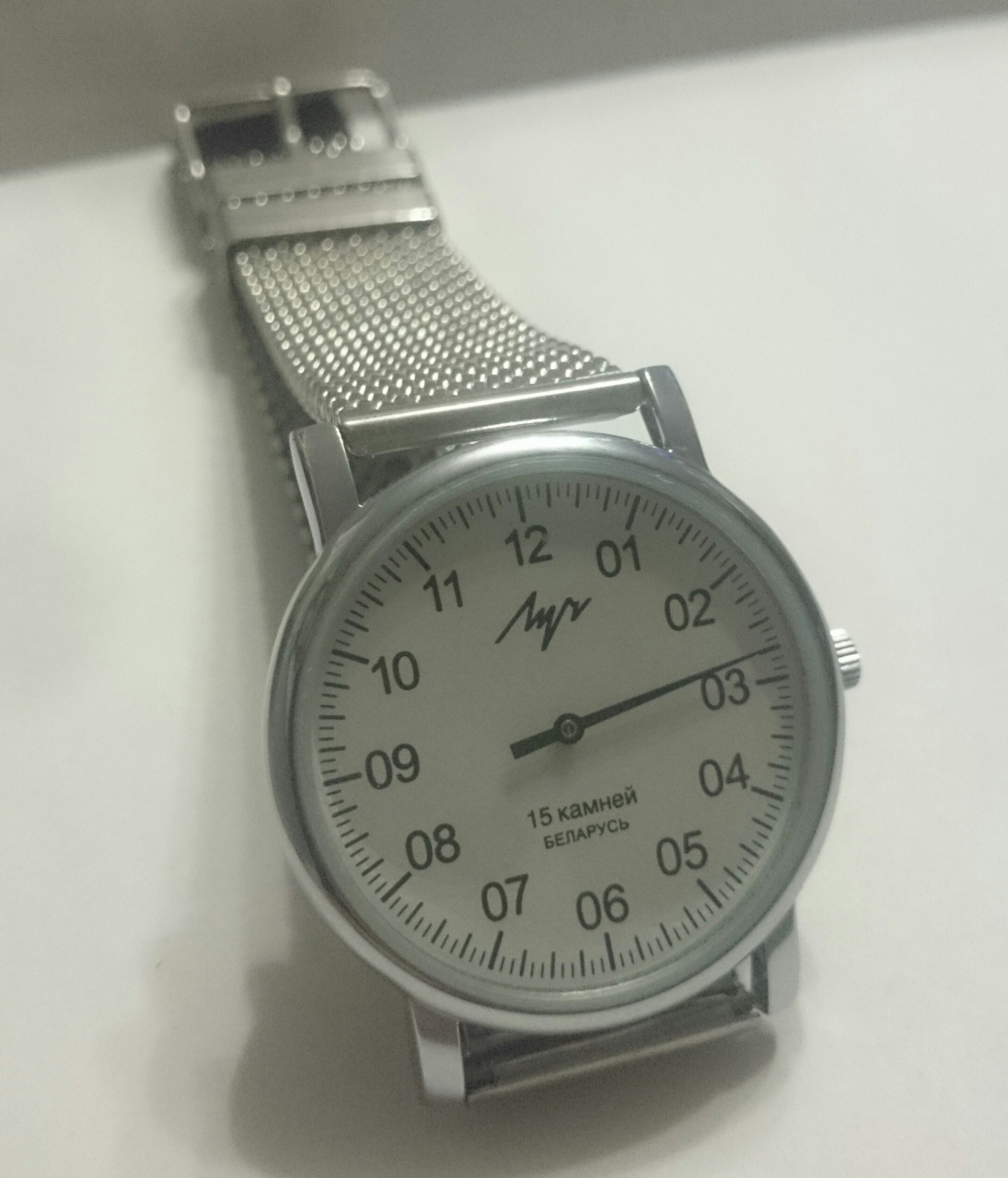 В продаже известные однострелочные часы Луч ("манометр"), пр-во Беларусь, механика, ручной завод. Состояние практически идеальное, надевались всего пару раз, остальное время лежали в шкатулке. Родной ремень ни разу не надевался, сразу после покупки был поставлен меш-ремешок. Диаметр небольшой - примерно 37-38 мм, но мелкими не смотрятся, на фото - часы на запястье 19 см. Причина продажи - наигрался, а часов много, эти уже почти год из шкатулки не доставал, пусть радуют нового владельца. В комплекте: сами часы на металлическом ремешке, родной лакированный ремешок, оригинальная коробка, документы.