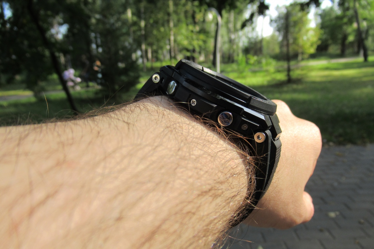 На моем запястье 16 см часы смотрятся неплохо, но еще чуть-чуть – и не поместились бы. Не «гирька», но ощущаются постоянно – «обнимают» руку, как теннисный напульсник. Это приятно. А хорошие материалы, обработка и продуманная конструкция оставляют впечатление качественной вещи.