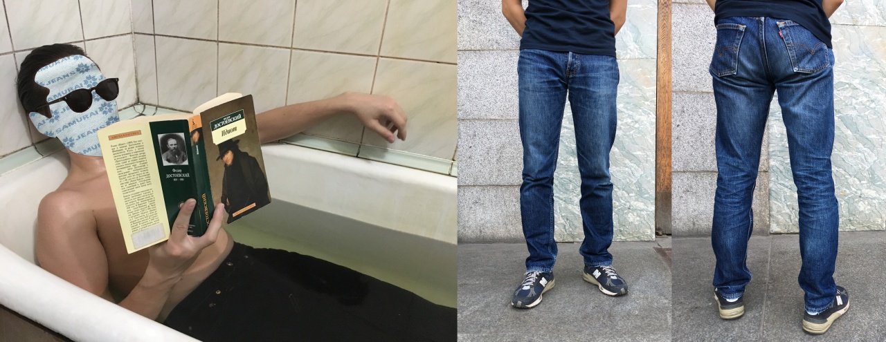 Кроме того, деним у новой пары сырой и накрахмаленный, поэтому встала необходимость усадки, которая была решена в пользу фэншуйного метода «на себе любимом». Чтобы скоротать получасовое откисание в ванне, с собой была прихвачена литература, и это не подходящее по случаю Бусидо, а русская классика с говорящим названием для тех, кто в 2017 году усаживает джинсы на себе и кому не чужда самоирония.