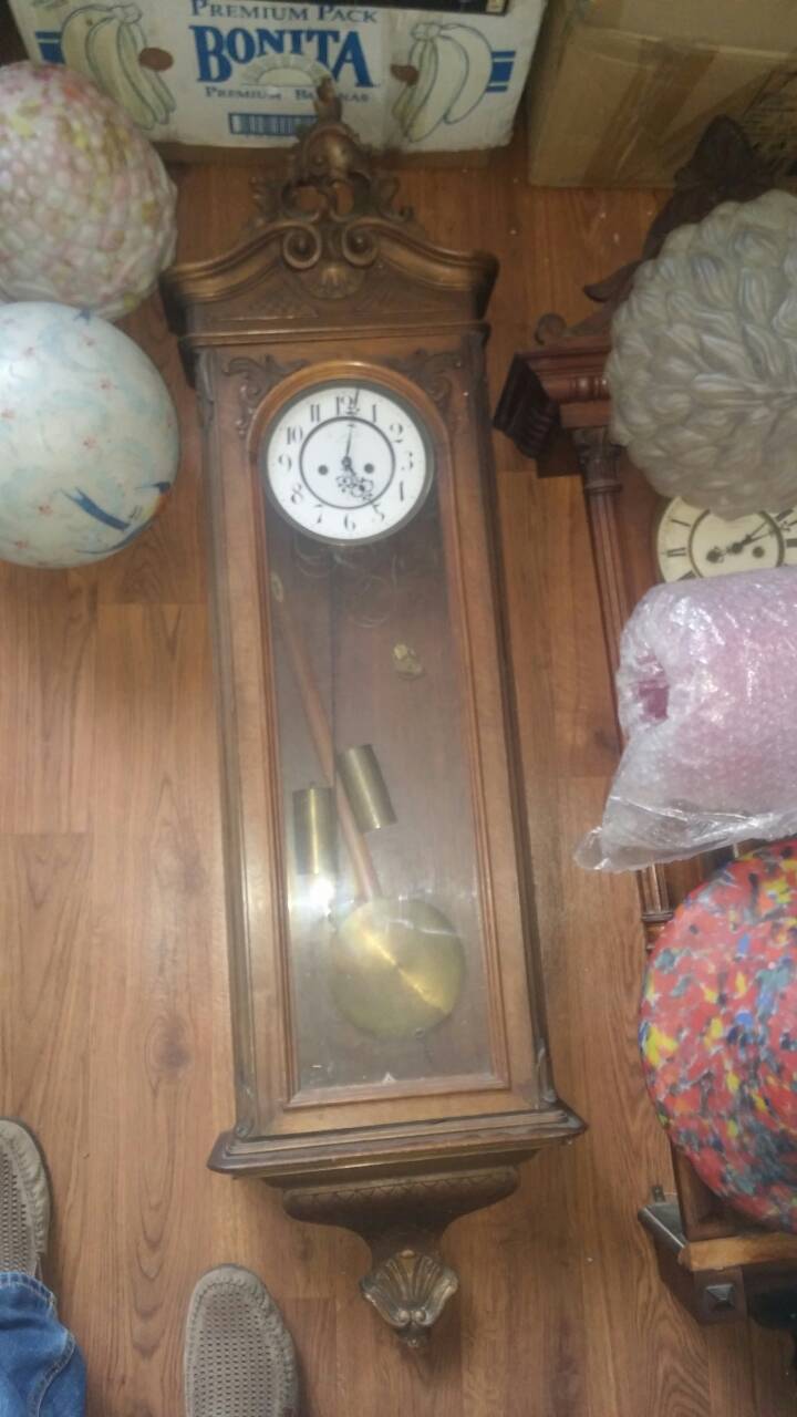 В корпус влюбился с первого взгляда, да ещё и маятник плюсом - всё это давно искал . Корпус довольно большой ,от киля до клотика 125см. шириной 40 , состояние для реставрации хорошее , немного пошатывается , незначительные утраты по резьбе ну и ключика от замка нет.