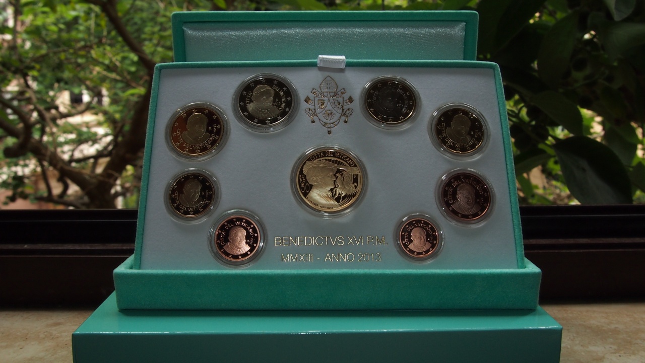 Набор примечателен тем, что на аверсе изображен герб главы Вселенской Церкви папы Римского Бенедикта XVI (Joseph Alois Ratzinger), которого там быть не должно, потому что папа неожиданно отрекся (11 февраля 2013 г. на консистории Бенедикт XVI объявил о своём решении отречься от престола с 28 февраля в связи с ухудшившимся состоянием здоровья, в действительности - со скандалами связанными с педофилией в Соборе Св. Петра) от престола в том же 2013 году – т.е. вместо герба папы на аверсе должен быть изображен период "Sede Vacante" ("При вакантном престоле").