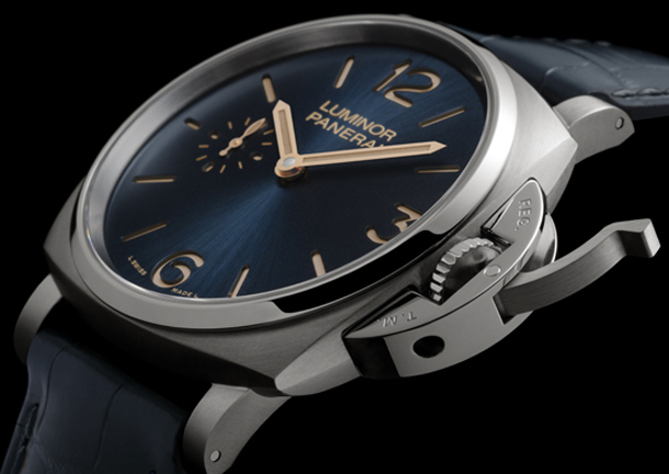 Циферблат нового Luminor Due 3 Days хорошо читаемый, даже в условиях плохой освещенности или ее отсутствии, имеет минималистский дизайн, в котором выделяется малая секундная стрелка на 9-ти часах. Это является еще одним аспектом, характерным для многих исторических часов Panerai. В титановой модели циферблат синего цвета, с сендвич-структурой и сатинированной отделкой. Модель из розового золота 18к обладает циферблатом цвета слоновой кости с контрастирующими синими цифрами.