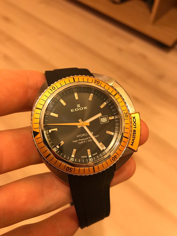 В продаже часы Edox Hydro Sub, небольшой косячек погнутый ползунок (видно на фото) на ход часов никак не повлияло, работают так же идеально как и работали