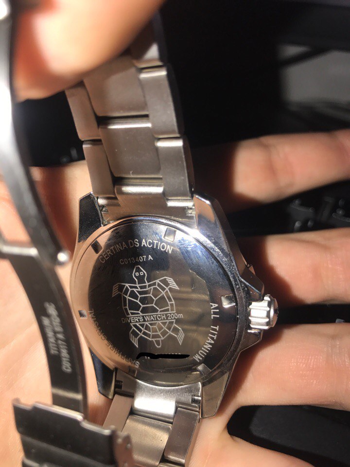 купил часы (certina ds action) у официального представителя но не в своем городе. т.к. в моем городе не было нужной модели. все приехало здорово с гарантией итд. но вот вопрос. почему у такой же стальной модели ( у меня титан), да и на других моделях на задней крышке черепаха объемная а у меня гравировка ? может быть я придераюсь? на фото: первые мои, вторые - фото из интернета таких же но стальных, третье-часы девушки.