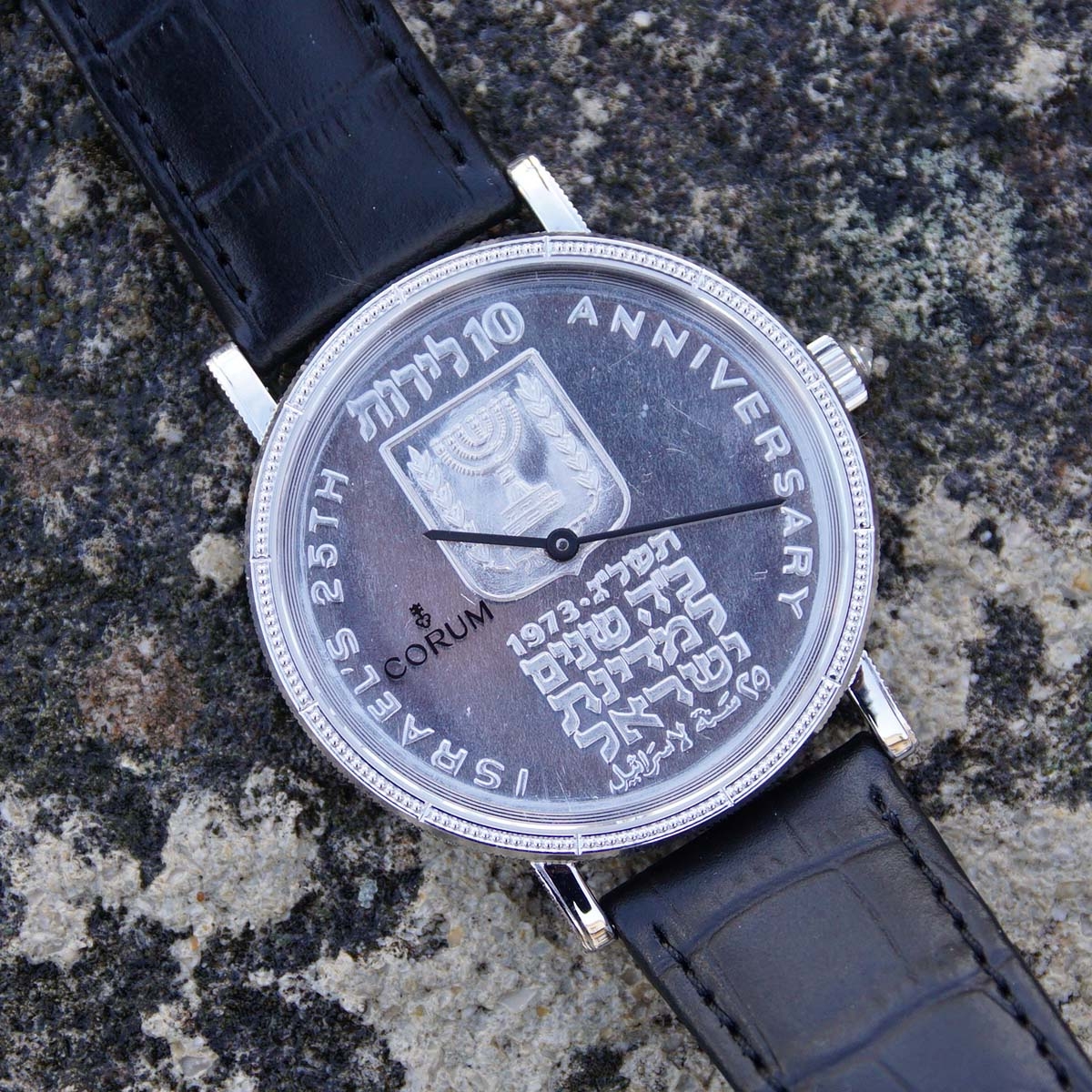 Циферблат первой представляет собой настоящую монету достоинством в 1 доллар, выполненную из серебра 925-й пробы. На аверсе изображен символ США – орел. Цвет стрелок, выполненных из вороненой стали, поддерживает надпись Corum, выполненная прямо под сапфировым стеклом часов методом декалькирования.