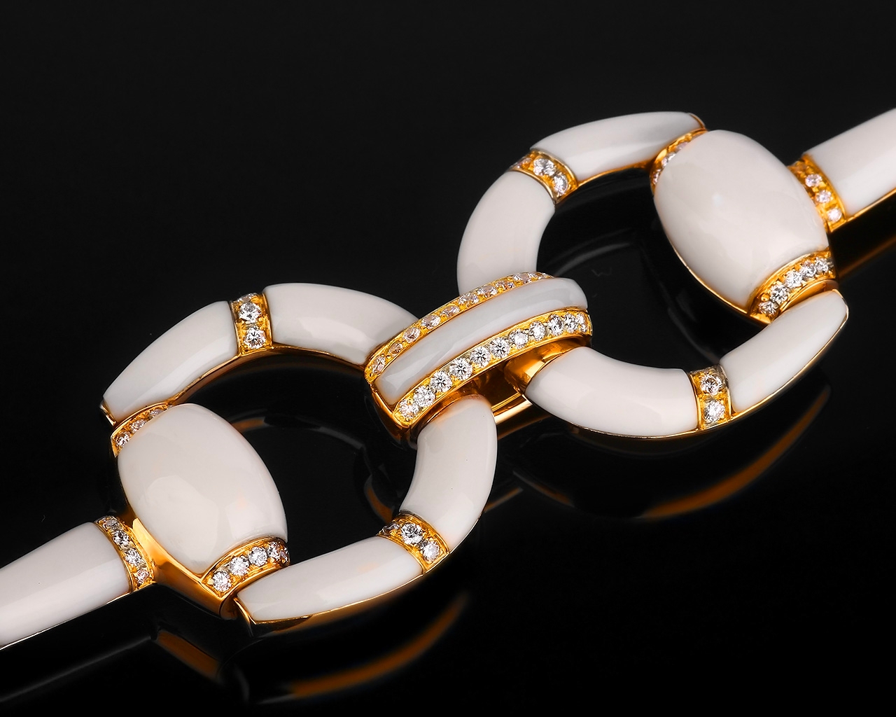 Представляем вашему вниманию прелестный золотой браслет с бриллиантами 1.01ct и керамикой от всемирно известного бренда Gucci из коллекции Horsebit.