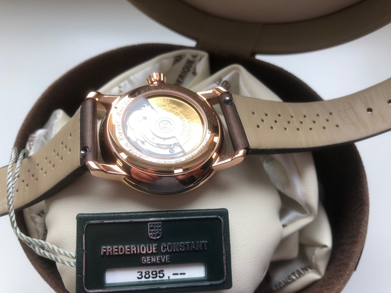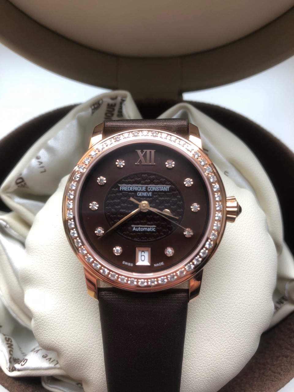 Позолота, 56 бриллиантов и коричневый циферблат.