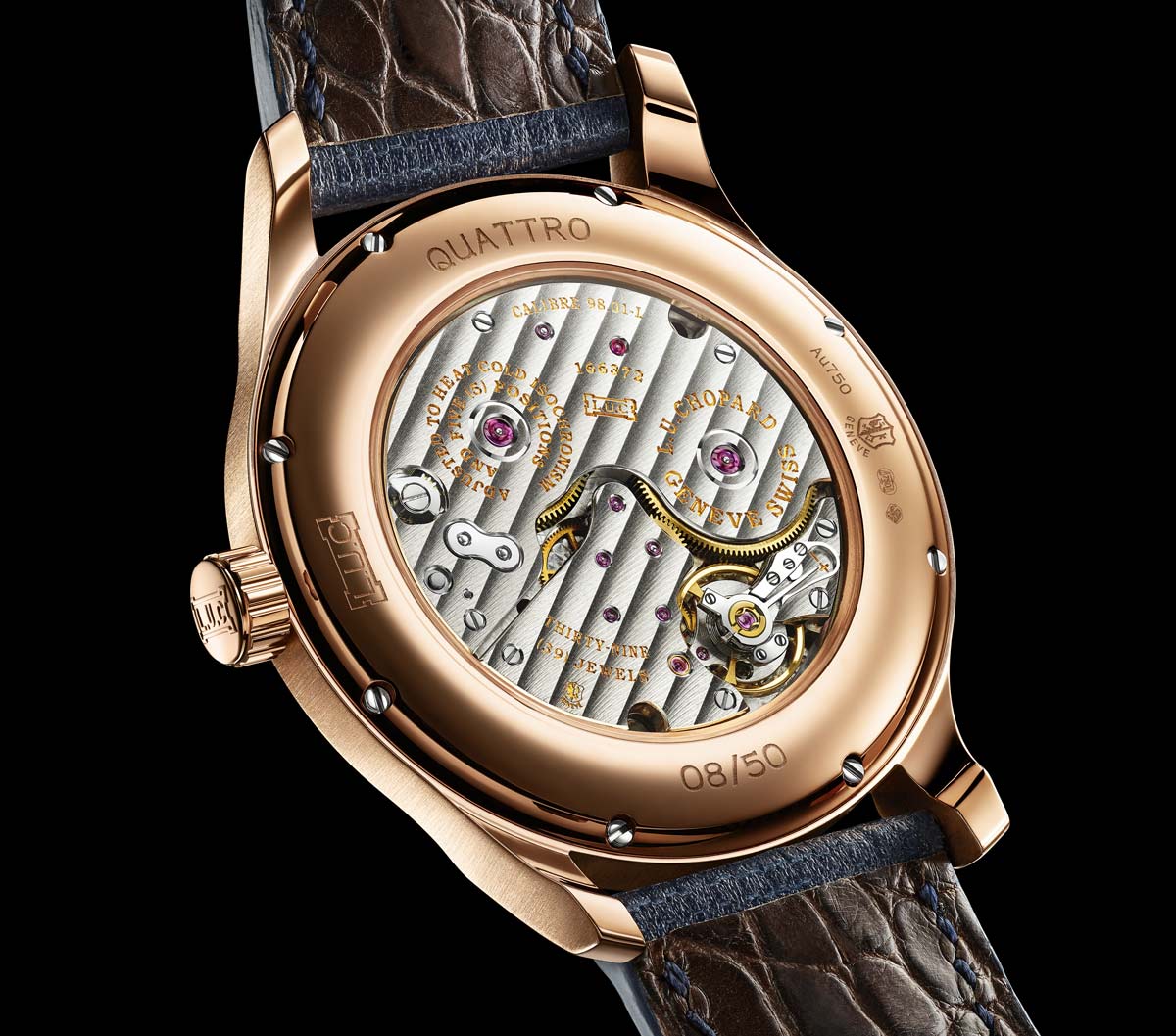 Круглый полированный корпус новинки, изготовленный из 18-каратного розового золота, диаметром 43,0 мм, водонепроницаемый до 50 метров. На торце рифленой заводной головки, расположенной на 3 часах, выгравирован логотип L.U.C. Сапфировое стекло с антибликовым покрытием установлено на передней стороне часового корпуса и на его завинчивающейся задней крышке. Циферблат серебристого цвета, отделанный вертикальным сатинированием, с накладными синими римскими цифрами, а также с синими часовой и минутной стрелками, покрытыми люминесцентным составом SuperLumiNova белого цвета. Модель оснащена мануфактурным швейцарским механизмом с ручным заводом L.U.C. 98.01-L, с четырьмя последовательно связанными заводными барабанами, с балансовой частотой 28800 полуколебаний в час (4 гц), запасом хода 216 часов (9 дней), функциями индикации часов, минут (посредством соответствующих центральных стрелок), секунд (на соответствующем малом боковом циферблате, расположенном на 6 часах), даты (посредством соответствующего круглого аналогового указателя, совмещенного с малым боковым циферблатом, расположенным на 6 часах) и запаса хода (посредством соответствующего аналогового указателя, расположенного на 12 часах). Калибр отлично отделан и декорирован (в частности мосты - "женевскими волнами" - Côtes de Genève), отмечен Женевским клеймом (Poinçon de Genève Hallmark), официально сертифицирован COSC в качестве хронометра.