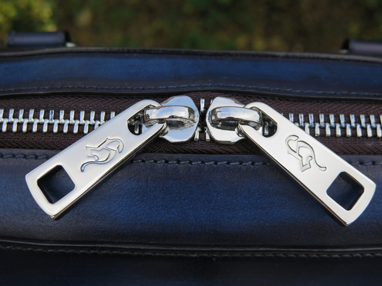 С обратной стороны сумка имеет тесненное изображение логотипа марки «Branchini Calzoleria» в виде герба. Внутренняя часть сумки изготовлена из кожи светло-коричневого цвета, и имеет одно большое отделение для переноски ноутбука, документов и прочих вещей, дополнительное отделение на молнии для хранения сотового телефона, бумажника, паспорта и прочих документов, и два дополнительных отделения.