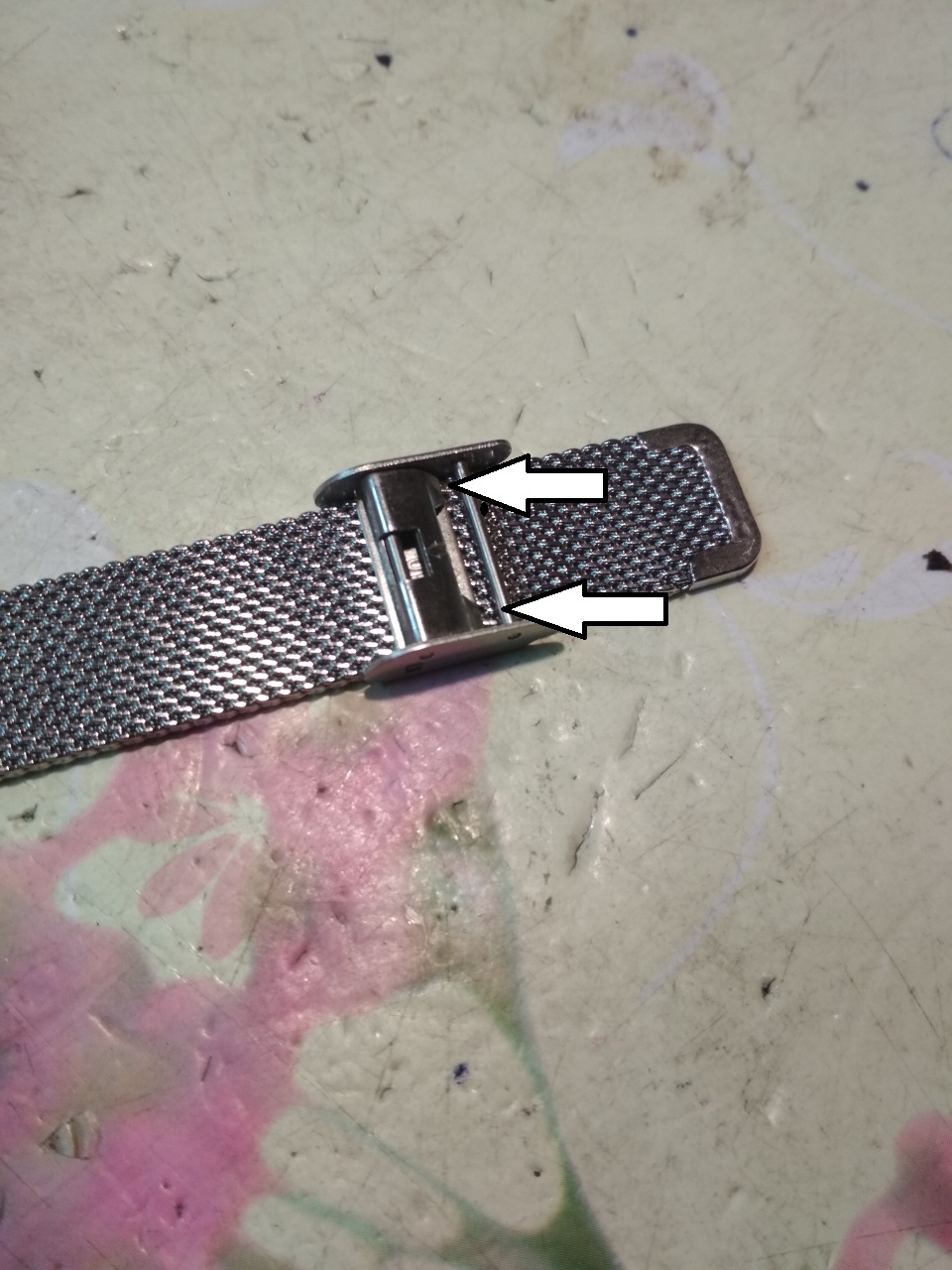 Да все просто! Если плохо фиксируется бегунок, надо аккуратно подогнуть лапки(показаны двумя стрелками) в сторону полотна браслета. Т.е. сделать угол изгиба лапок более острым.