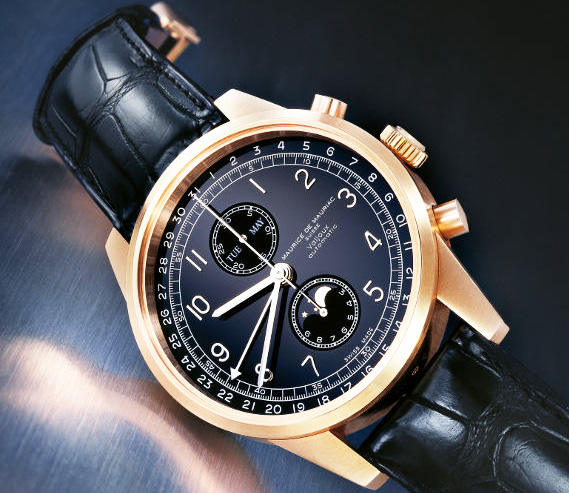 Модель Moon Chronograph от Maurice de Mauriac объединяет в себе безупречно гармоничный дизайн с широким спектром часовых усложнений - годовой календарь, индикатор фаз Луны и хронограф.