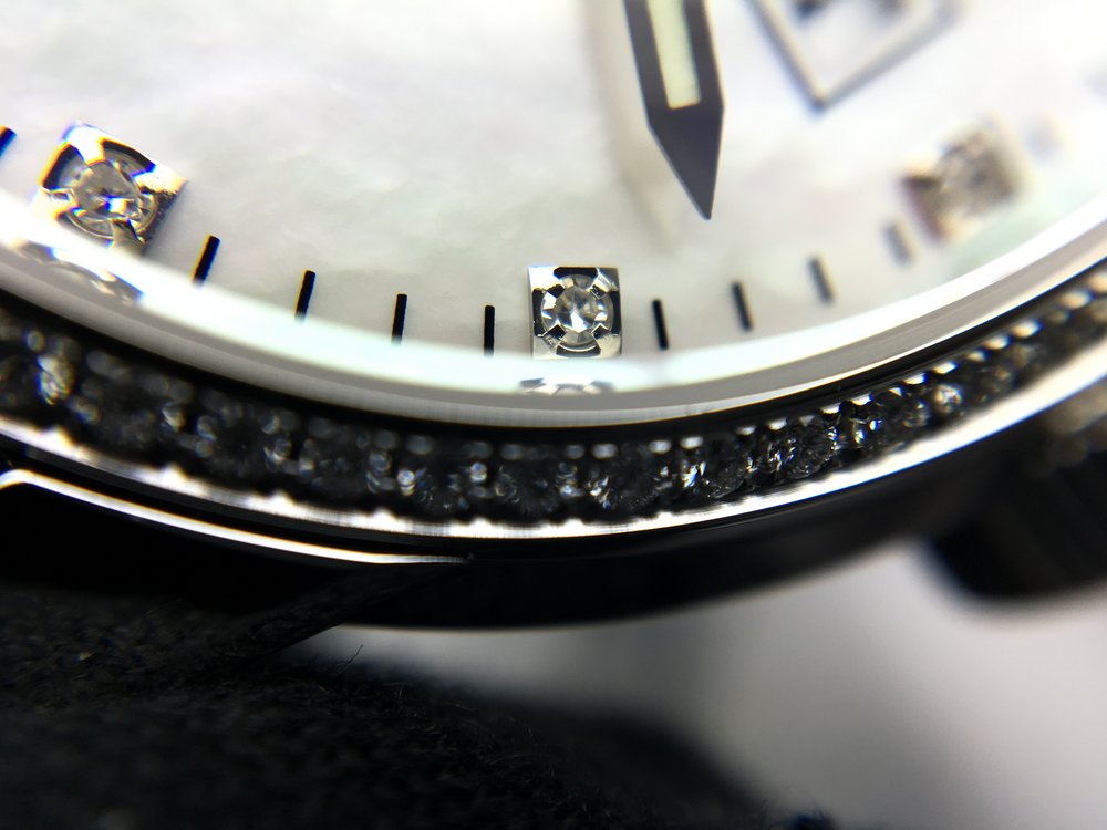 Корпус и перламутровый циферблат украшен бриллиантами: