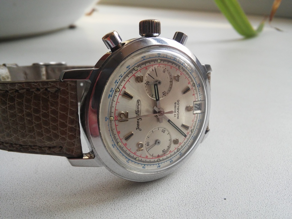 Швейцарский винтажный механический хронограф Jean Jullemin. Великолепное состояние, отличный ход, дата. Механизму сделан репассаж. Корпус- Нерж сталь.