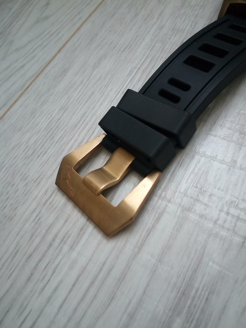 . Чуть начали патинироваться. В комплекте: часы на родном каучуке, родной кожаный ремень с баклей, карточка гарантии, отвертка для смены ремня, запасные винтовые шпильки. Родной коробки нет.