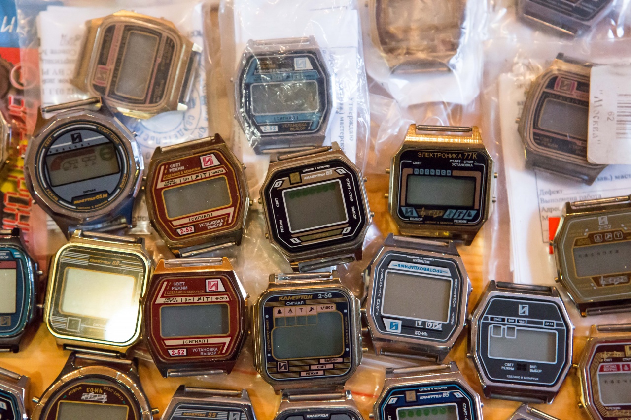 Часов много, есть с потекшим экраном, есть б/у, многие с паспортами.