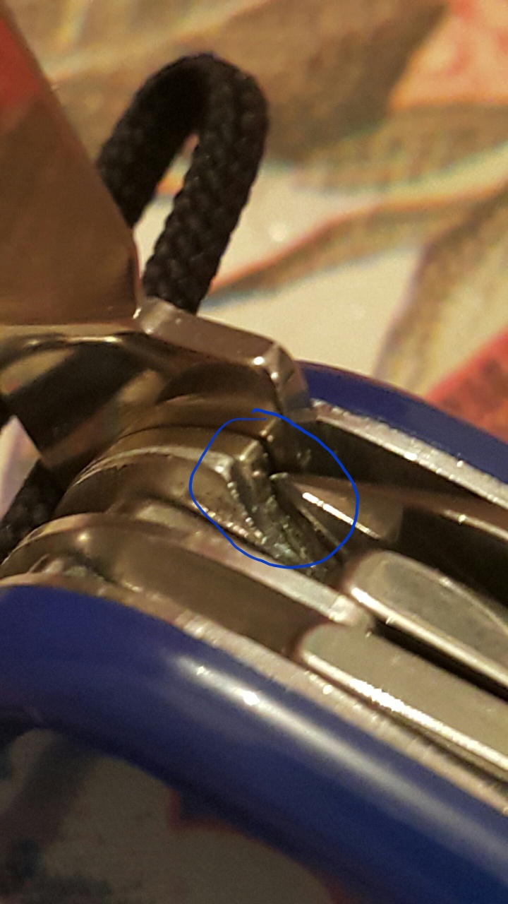 Приветствую! Обратил внимание, что на моём Victorinox Climber если закрываешь малое лезвие, то одна пластина, не знаю как она правильно называется, бьёт в острие основного клинка и там закусы на лезвие маленькие от этого. Это брак или такое качество штамповки швейцарцев? Фото плохого качества извините, но гляньте пожалуйста и посоветуйте что с этим делать. Переточить новейший нож которому месяц.