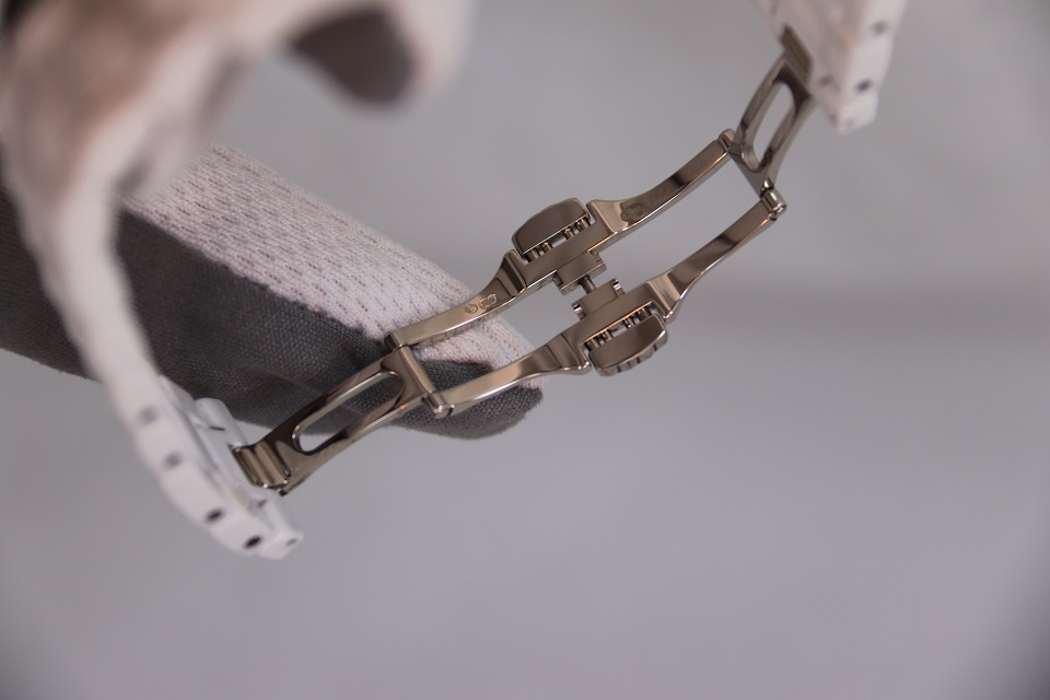 Безель из белого золота украшен бриллиантами багетной огранки. Циферблат часов украшен бриллиантами круглой огранки.