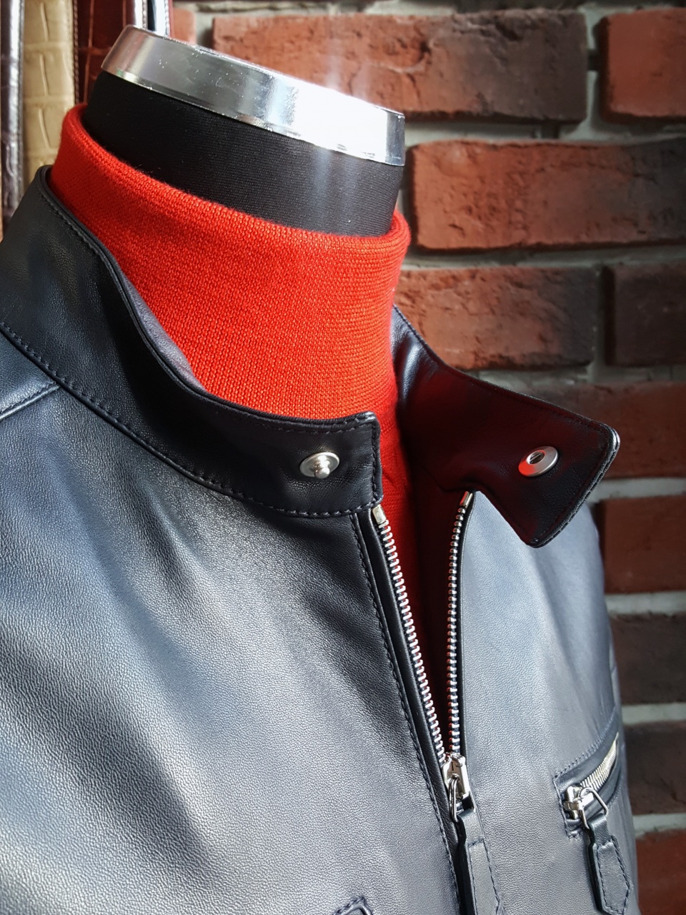 Куртка застегивается на молнию с бегунком из кожи и имеет два нагрудных кармана, застёгивающиеся на молнию, два боковых кармана прорезных кармана, застёгивающиеся на молнию.