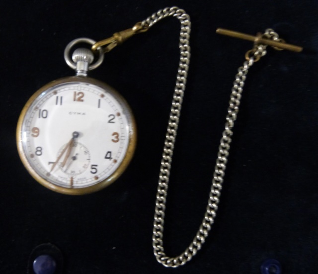 Помогите оценить винтажные "фронтовые" карманные часы Cyma с цепочкой