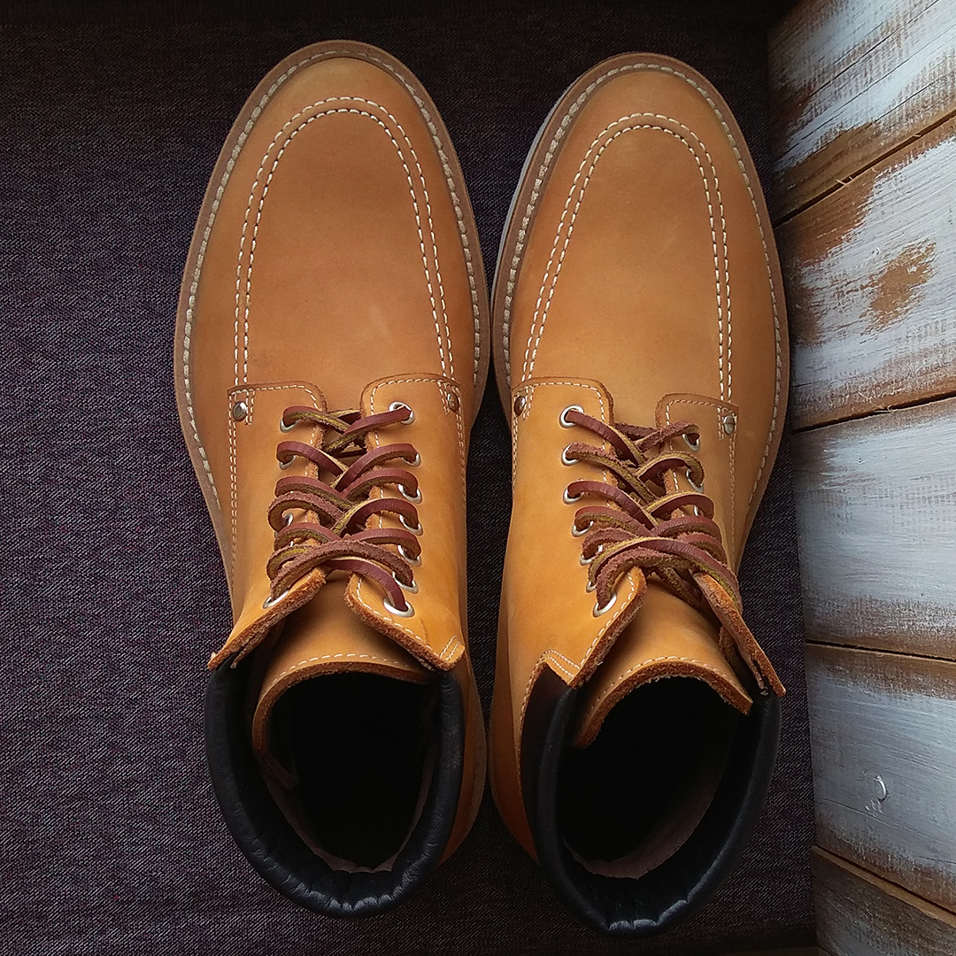 Верх из очень толстого и мягкого жёлтого нубука (толщина кожи верха + подкладки = ~ 4 мм). Полная подкладка из мягчайшей телячьей кожи, кожаная стелька, кожаные шнурки. В комплекте идёт брендированный мешок-пыльник. Подошва Vibram Morflex, благодаря чему очень мало весят.