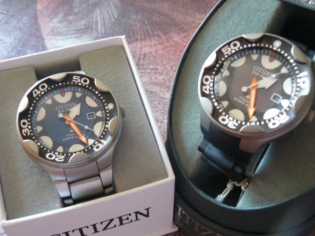 иногда появляются вопросы-какие бывают орки?в отличии от разноцветья монстров,орки,насколько мне известно,только синяя на титановом браслете и черная на каучуке.иногда редко редко бывает и черная на титановом браслете.на крышке у синей только титан,у черной титан и стальной задник-по надписям,хотя и там и там стальная задняя крышка.цвет титана на синей чутка светлее,на черной более темнее,как бы матовый.титан по опыту синей(черную взял до кучи еще не решил буду носить или как...)на редкость царапоустойчивый.