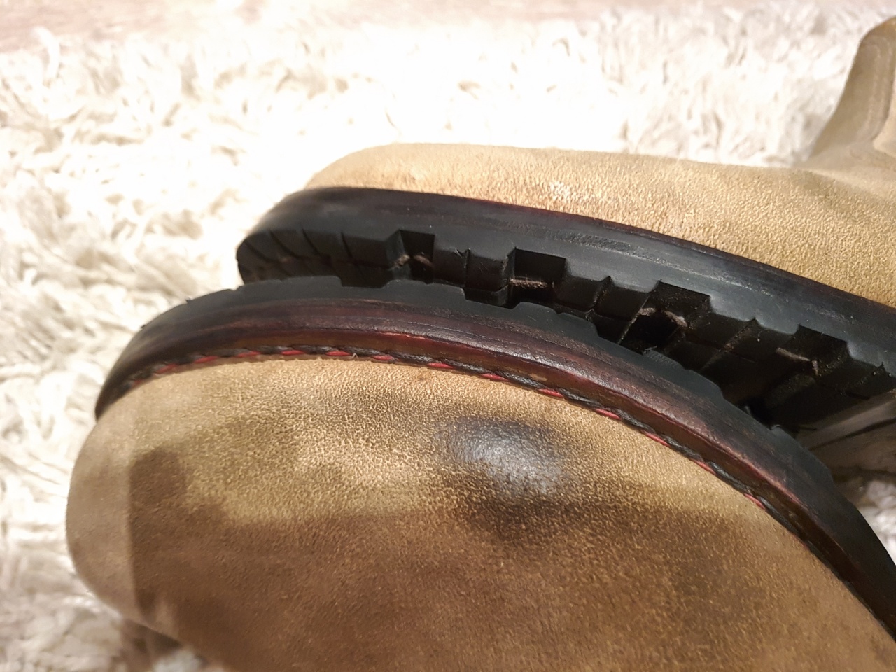 На последнем фото сквозная дырка, зашитая "тяп-ляп", выходит, вибраму год. Кстати, если бы я сейчас купил бекманы, то сразу бы заменил профилактику на vibram, настолько огромная разница по пластичности и сцеплению, зимой тоже супер, но я в них редко по снегу.