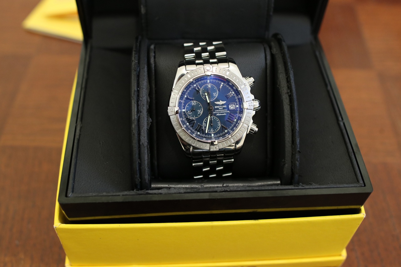Шикарный классический хронограф от Breitling! Очень синий красивый циферблат с римскими цифрами ! Часы после полировки и репассажа! Ход великолепный! Браслет длинный! Есть все инструкции но сертификат утерян!
