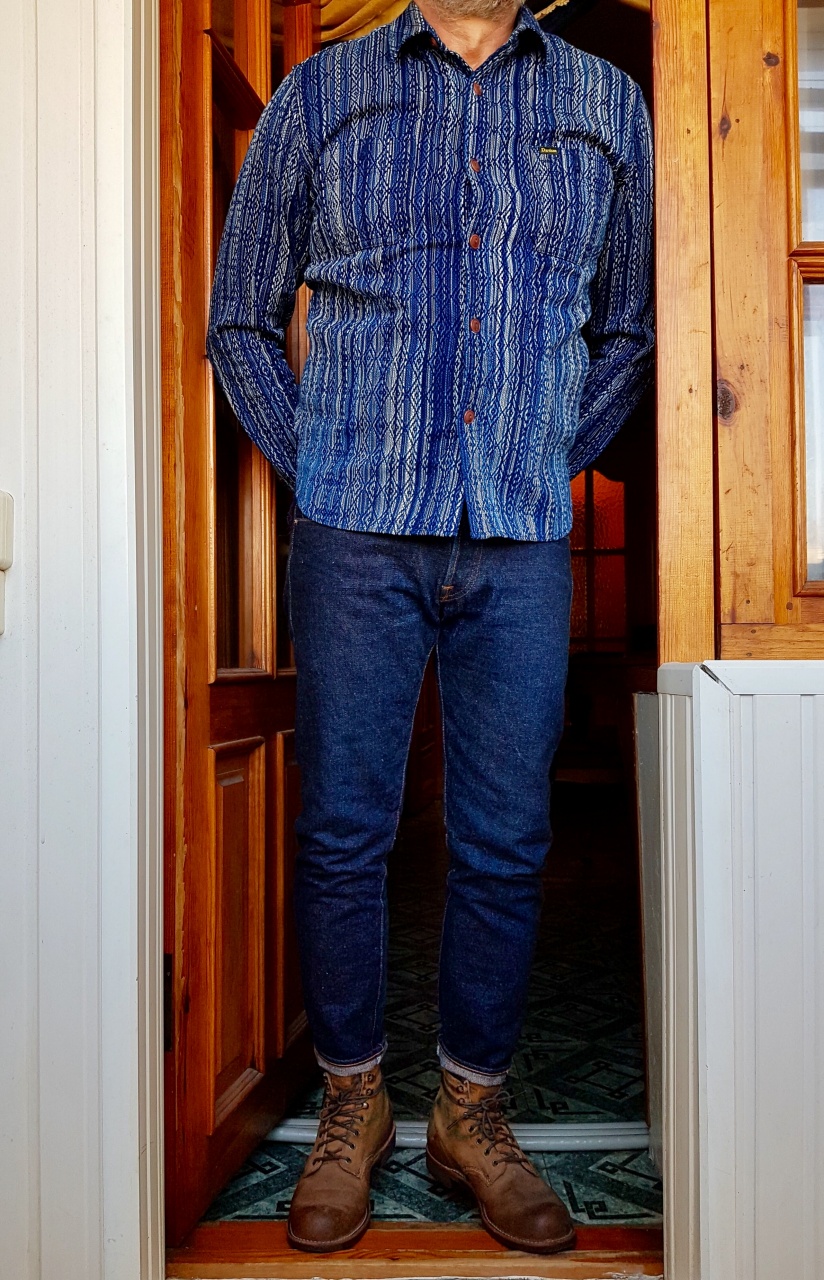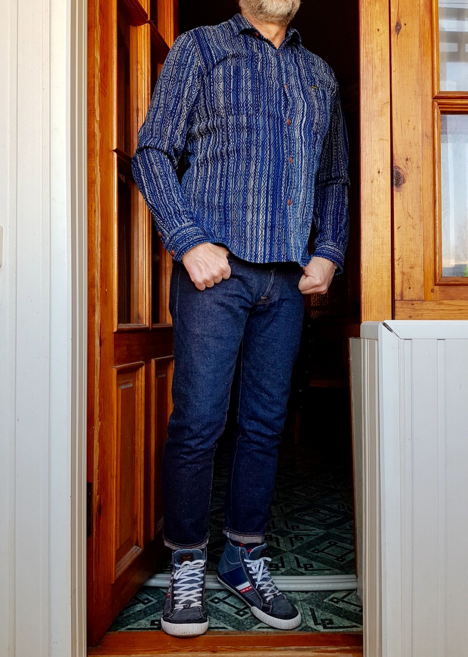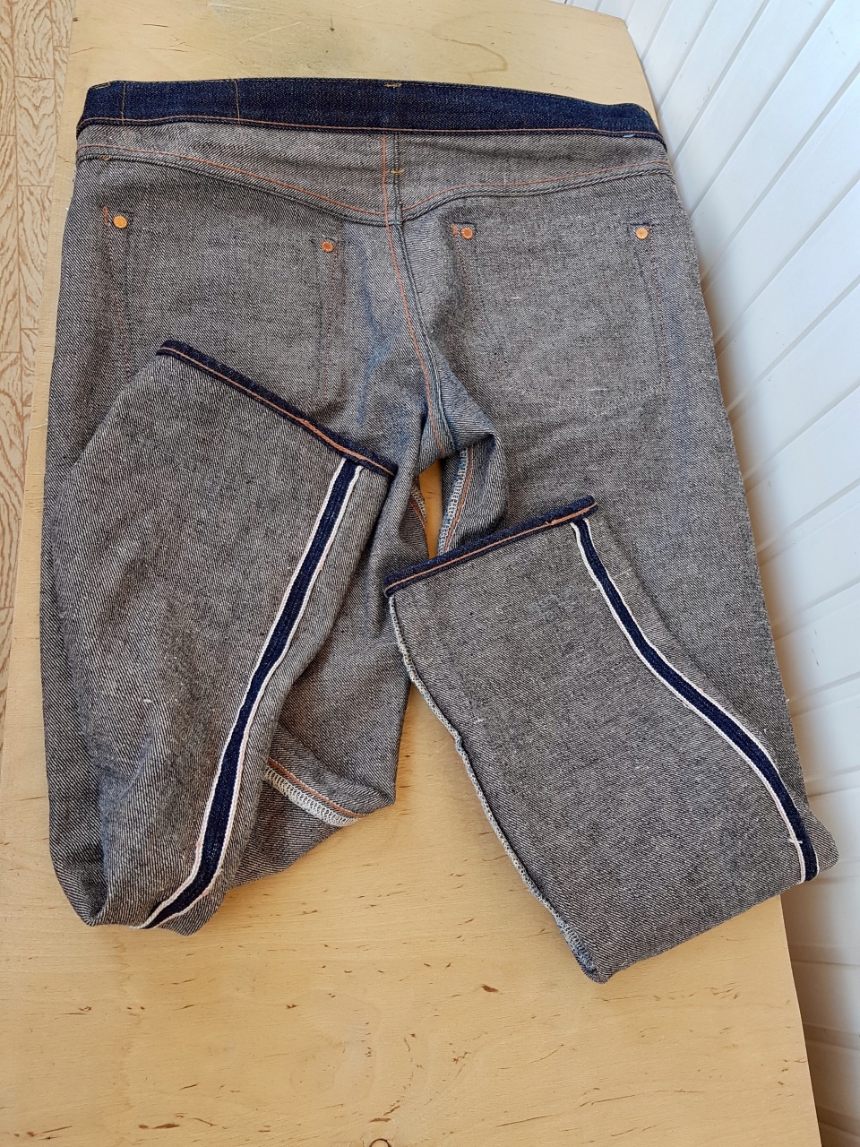 ....тактильно 16 унцовый деним явно тянет на побольше , структурно зернистый , напомнил мне ОНИевский «SECRET DENIM” . Очень интересный необычный окрас основы ....вкупе с серым неотбеленным утком смотрится толково . Ещё один момент - несмотря на плотность , деним очень тёплый