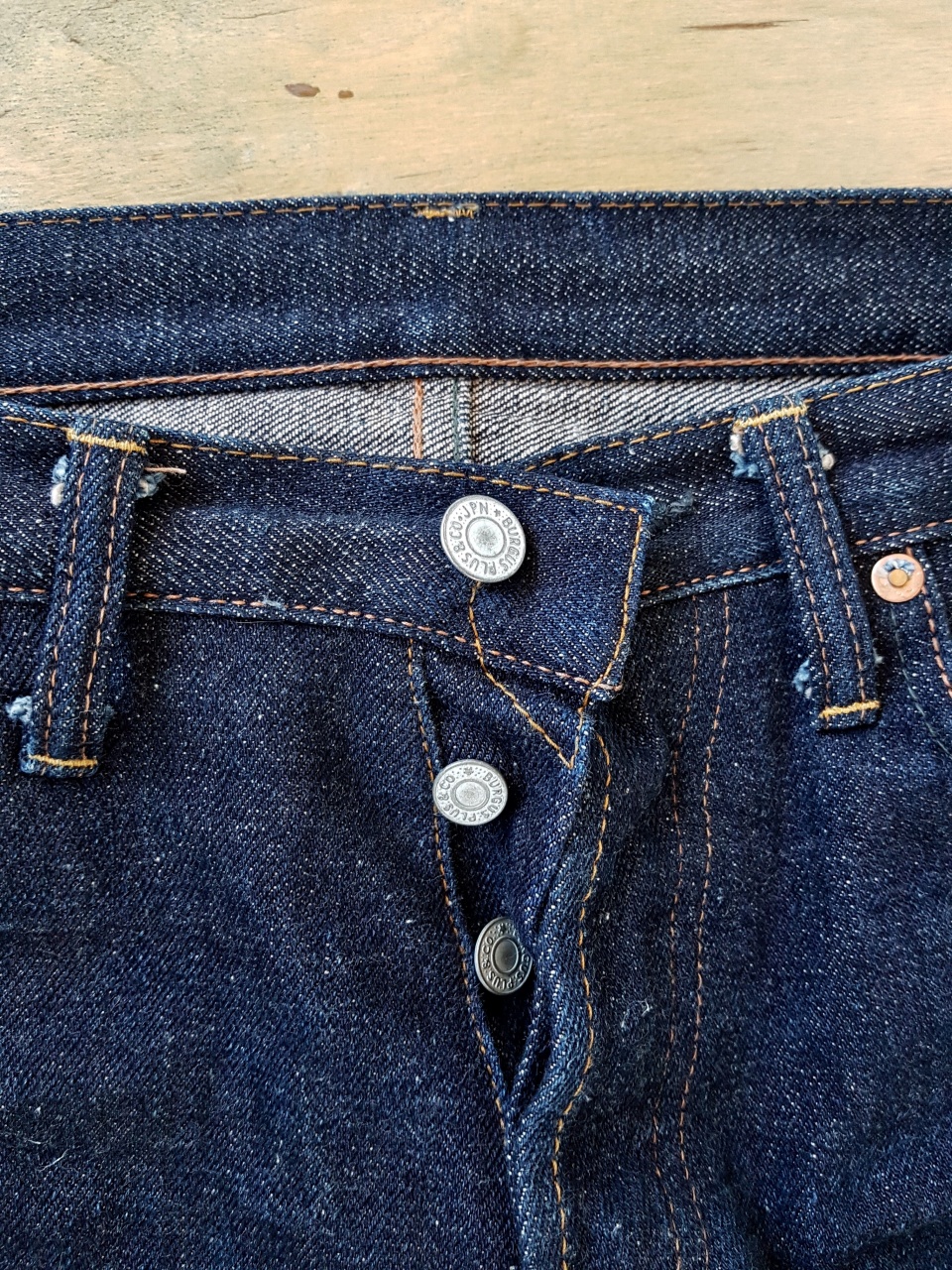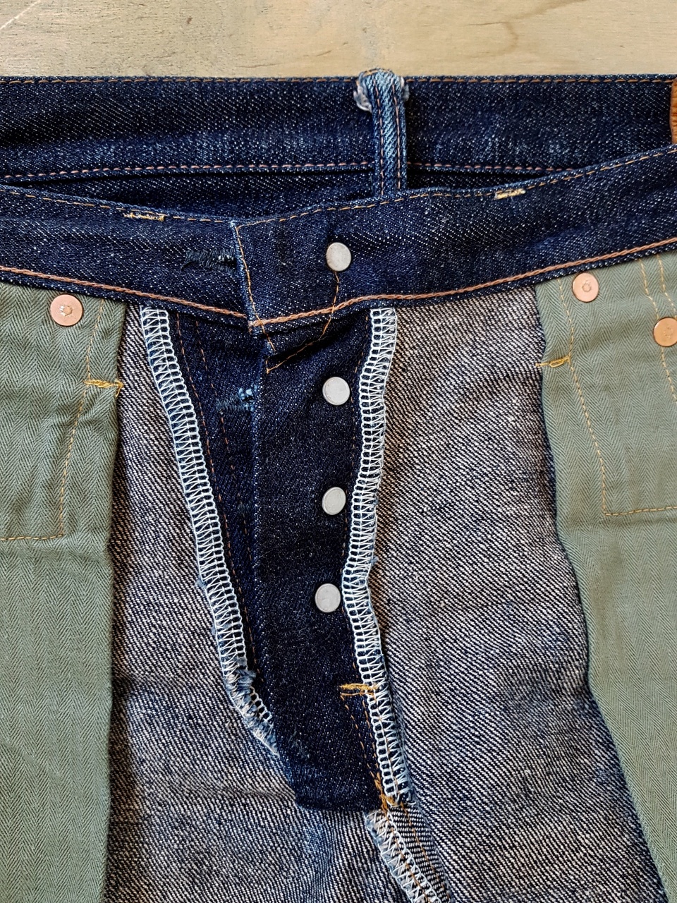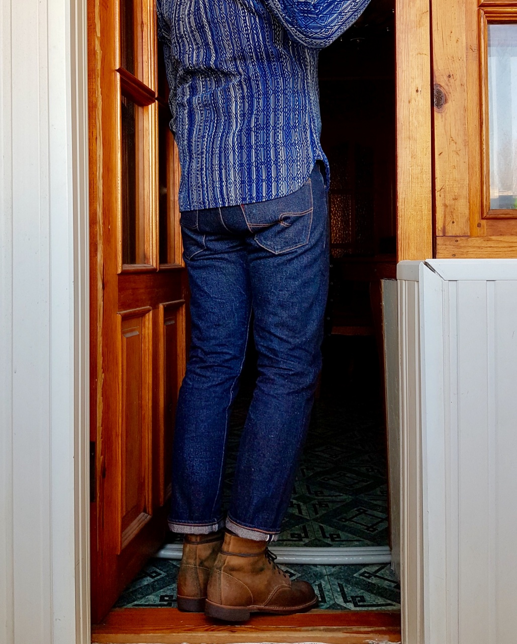....тактильно 16 унцовый деним явно тянет на побольше , структурно зернистый , напомнил мне ОНИевский «SECRET DENIM” . Очень интересный необычный окрас основы ....вкупе с серым неотбеленным утком смотрится толково . Ещё один момент - несмотря на плотность , деним очень тёплый