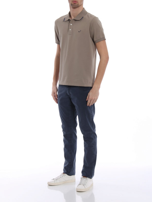 Поло застёгивается на 3 (три) фирменные пуговицы с выгравированным названием марки Jасоb Соhёn, изготовленные из австралийского перламутра. Внутренняя сторона воротника украшена джинсовым сэлвиджем.
