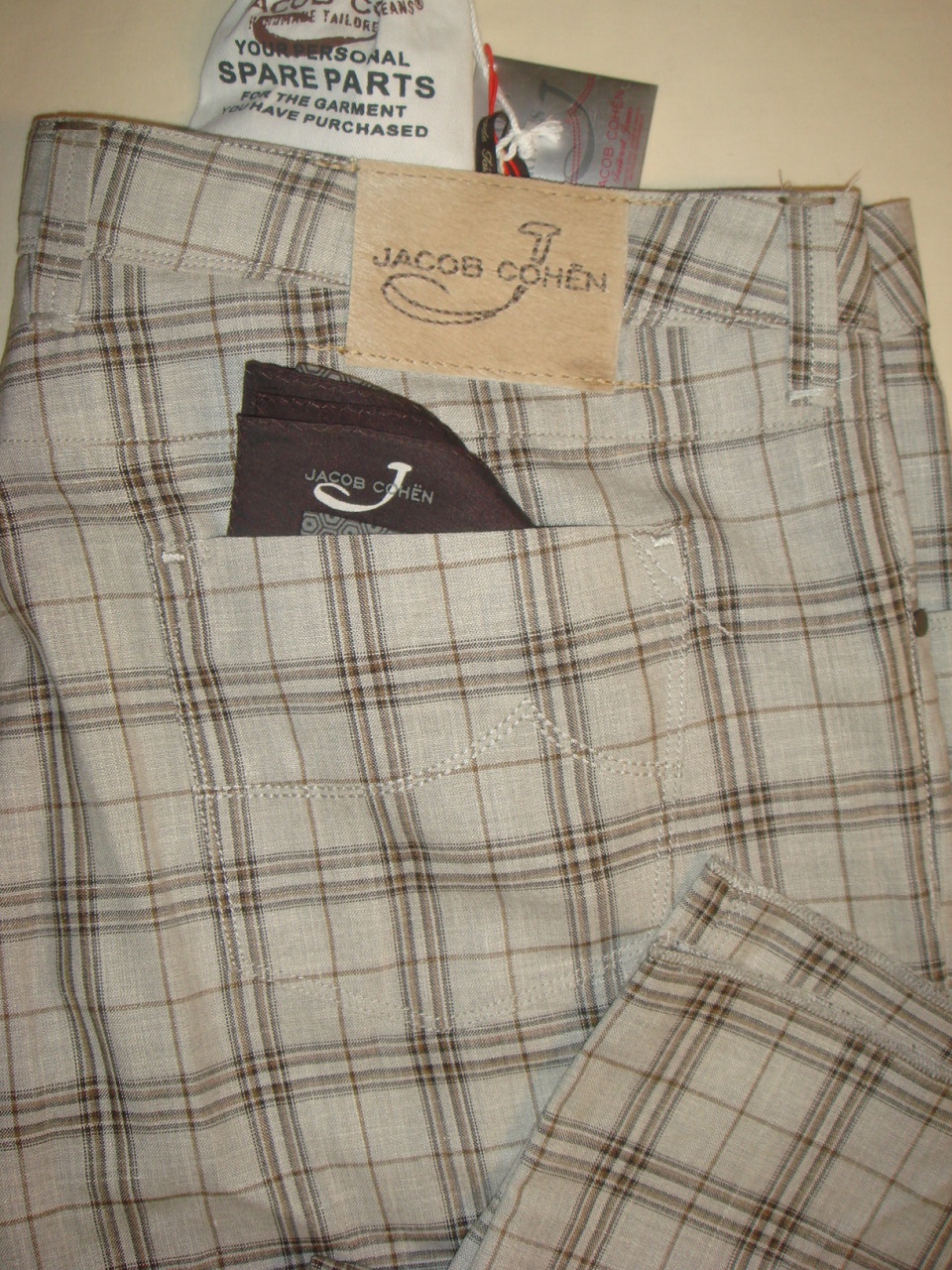 Продаются новые мужские летние шерстяные брюки джинсового кроя ручной работы итальянского бренда JACOB COHEN, превосходного исполнения, цвет светло-серый в коричневую клетку, логотип, TYPE 688 , клаcическая посадка на талии (regular fit), застёгивается на пуговицы из буйволиного рога и основную фирменную посеребренную пуговицу с логотипом бренда, фирменный ярлык из кожи пони бежевого цвета с вышитым логотипом марки Jасоb Соhёn, к брюкам прилагается платок, состав: 70% высококачественная шерсть( фабрика Loro Piana) , 15% шелк, 15 % лен, все бирки прилагаются , гарантированный 100% оригинал, размер 42 , производство Италия