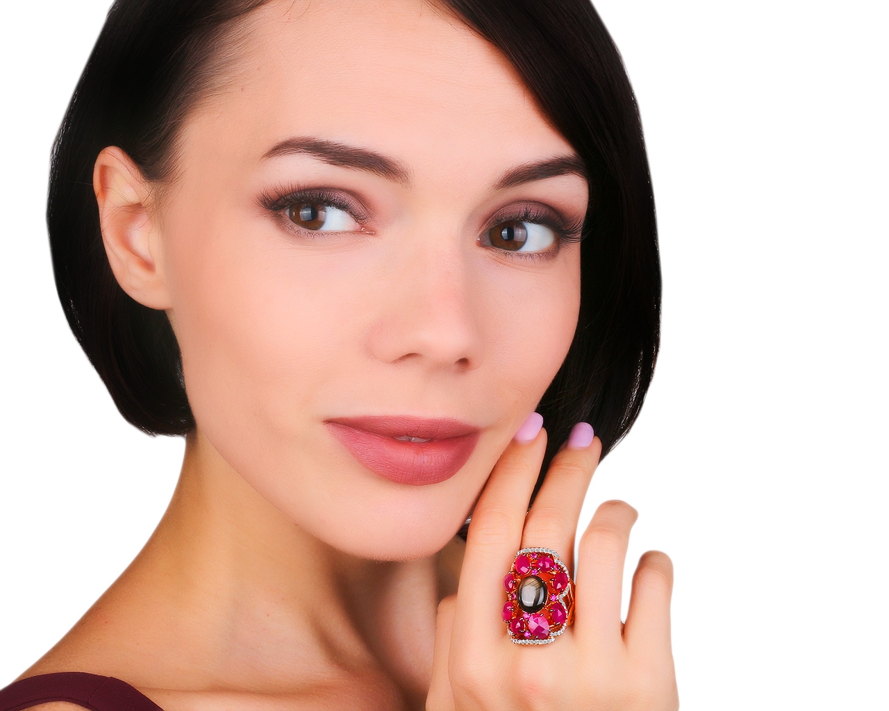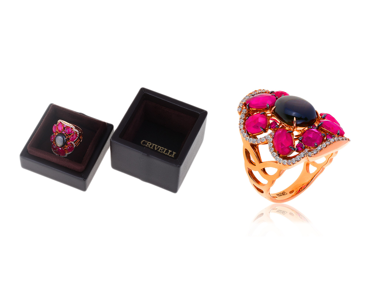 Представляем вашему вниманию женственное золотое кольцо с бриллиантами 0.68ct, сапфиром 7.00ct и рубинами 7.53ct от всемирно известного бренда Crivelli.
