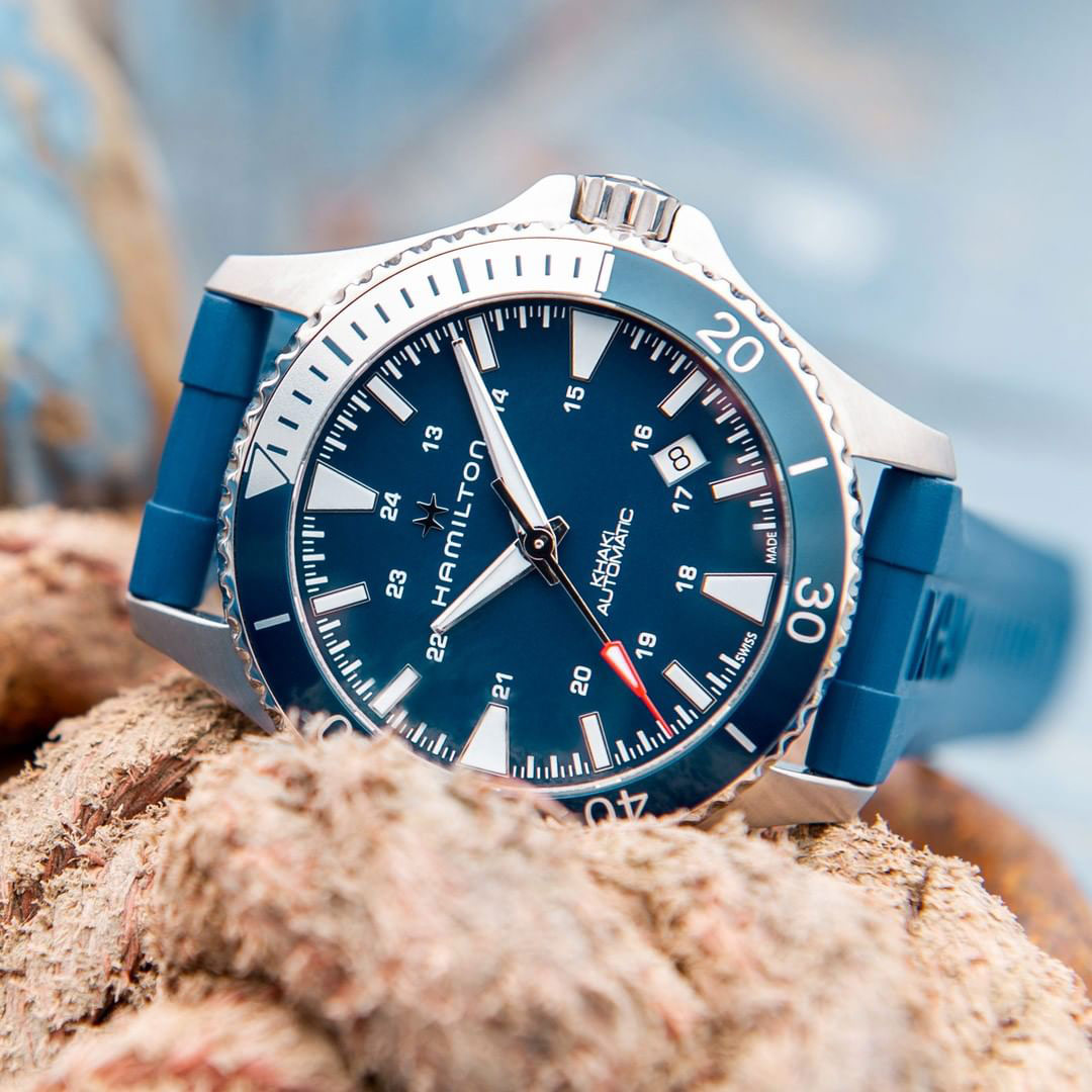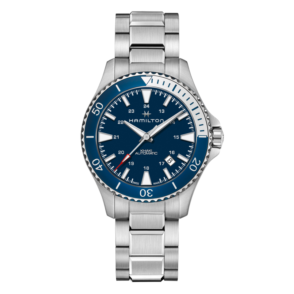 Круглый корпус новинки, изготовленный из нержавеющей стали, диаметром 40,0 мм, водонепроницаемый до 100 метров. На торце защищенной рифленой заводной головки, расположенной на 3 часах, выгравировано изображение логотипа бренда Hamilton. Вращающийся безель с дайверской разметкой. Сапфировое стекло с антибликовым покрытием защищает синий циферблат с накладными часовыми индексами, покрытыми, как и стрелки, люминесцентным составом SuperLumiNova белого цвета.