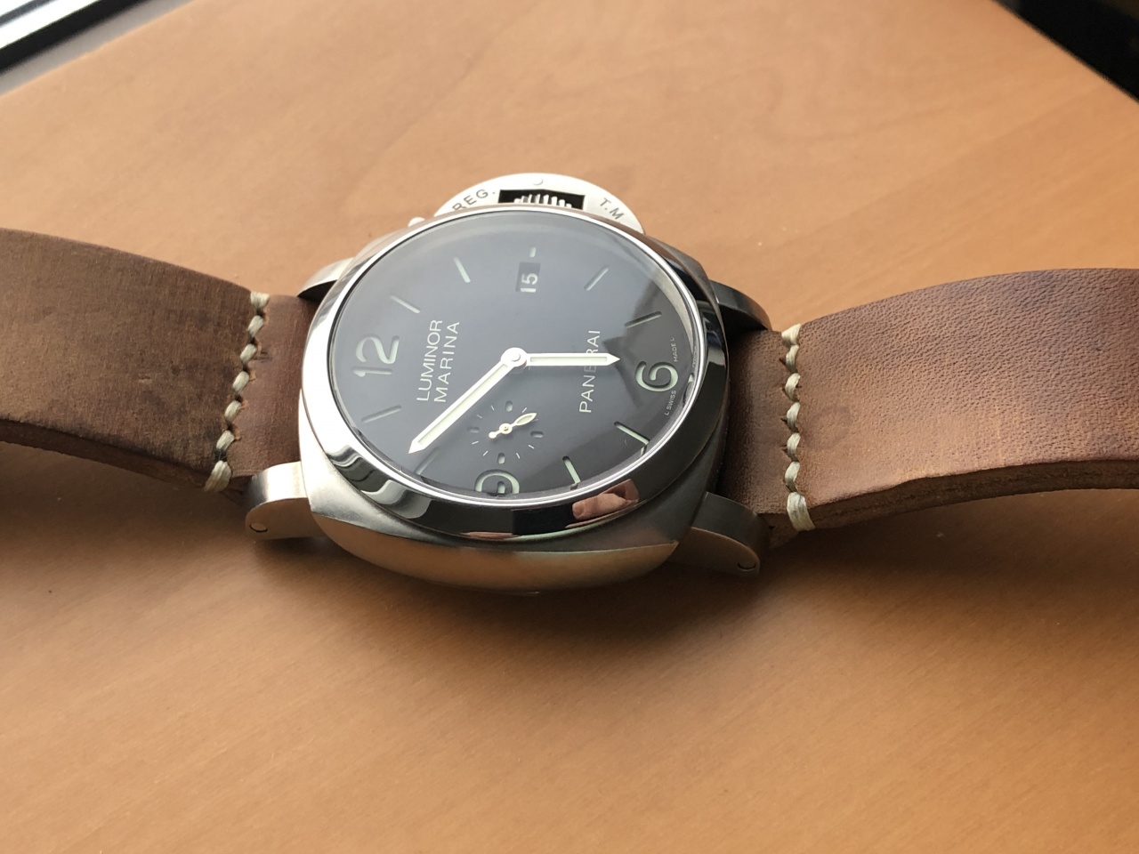 Титановые PAM352 с золотыми стрелками и табачным циферблатом сэндвич. Браслет полный +2 новых ремня в подарок.