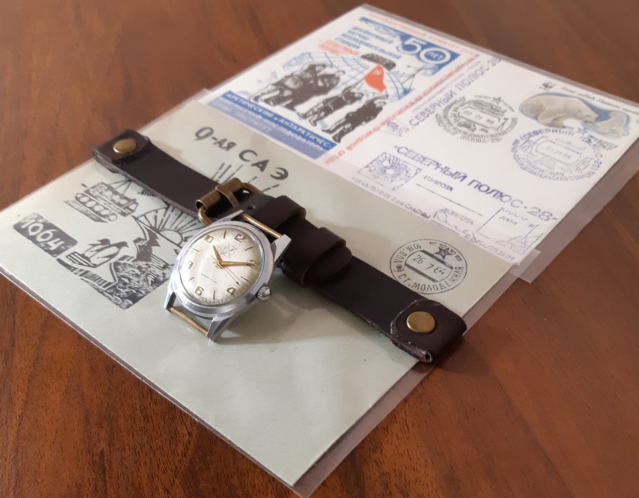 Часы (Полюс), новый кожаный винтажный ремешок, два конверта Южн. и Сев. Полюс, отправка по России первым классом. = 33 300 руб.