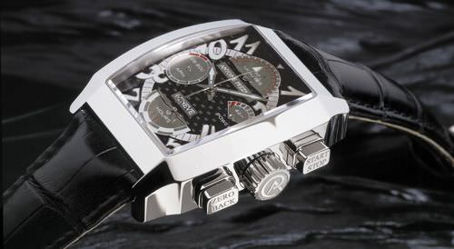 Прочный изогнутый прямоугольный корпус размерами 50 x 38 мм выполнен из нержавеющей стали. Черный двухуровневый циферблат, выполненный из углеродного волокна, оснащен часовыми метками в виде больших арабских наклонных цифр.